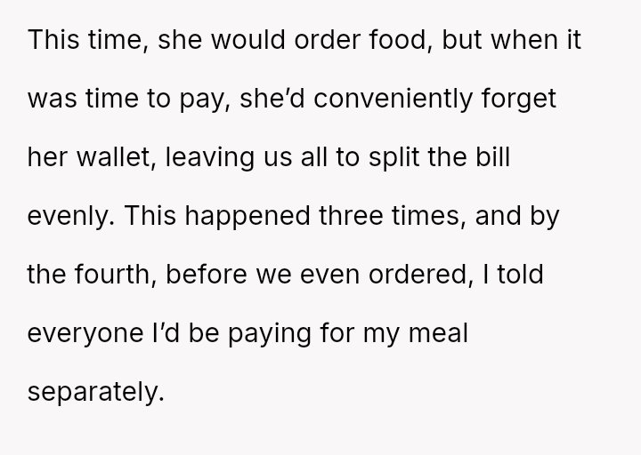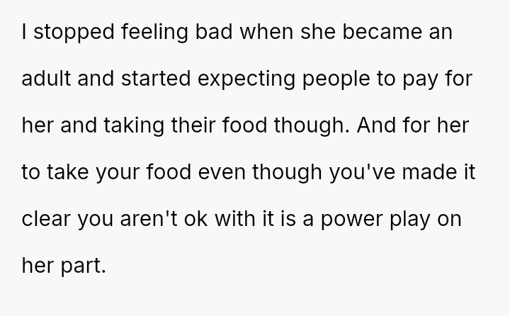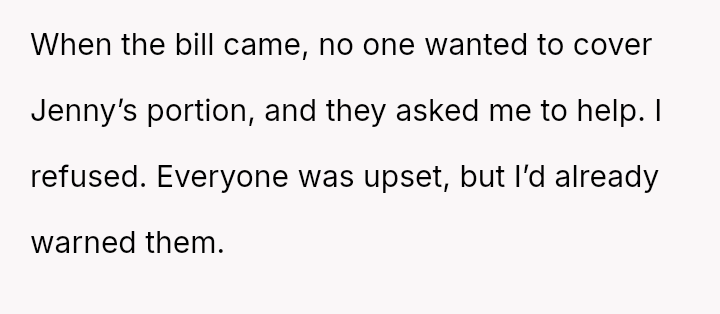 The original poster (OP) consistently felt taken advantage of by Jenny, primarily regarding shared food costs and poor table etiquette, leading to multiple attempts to set boundaries.