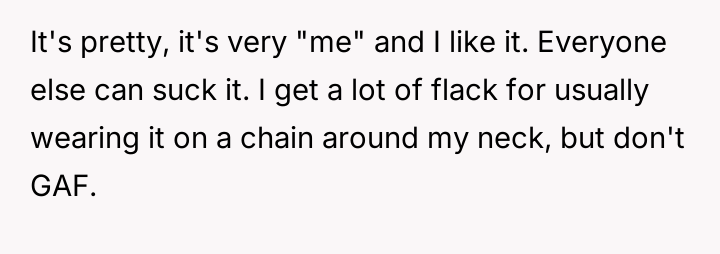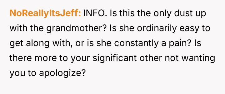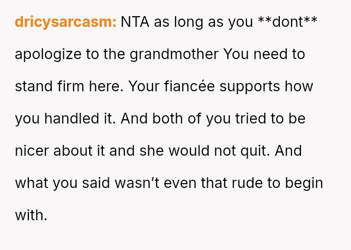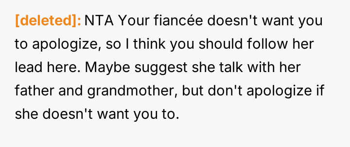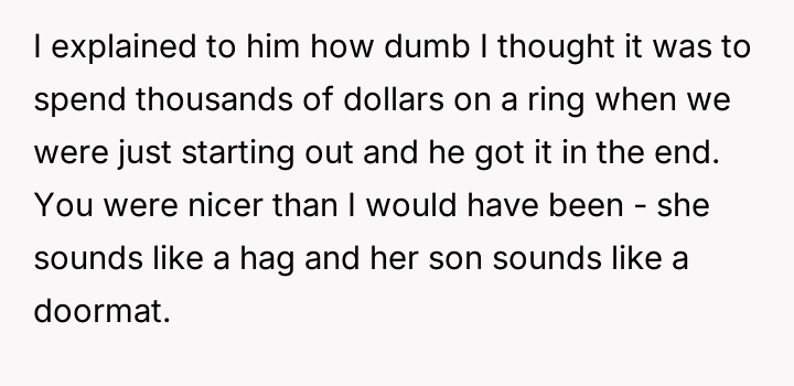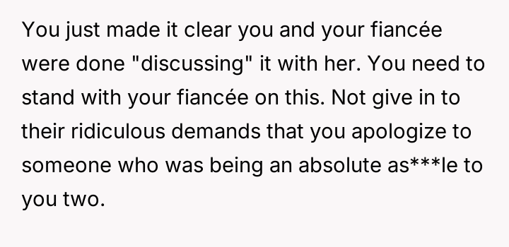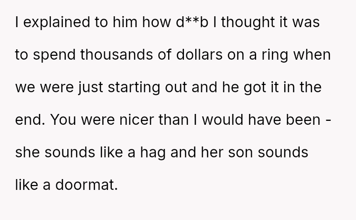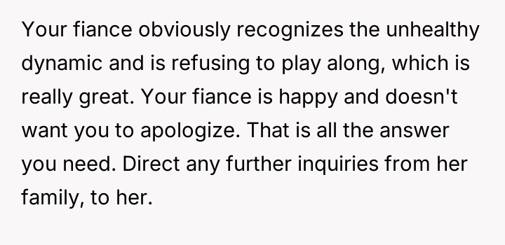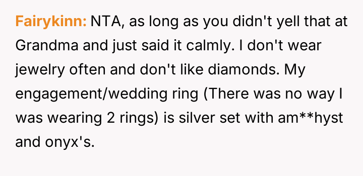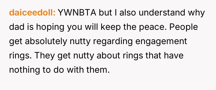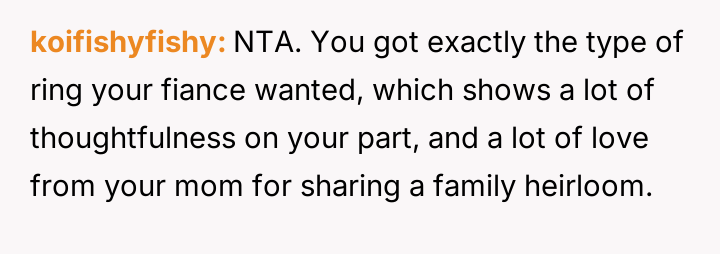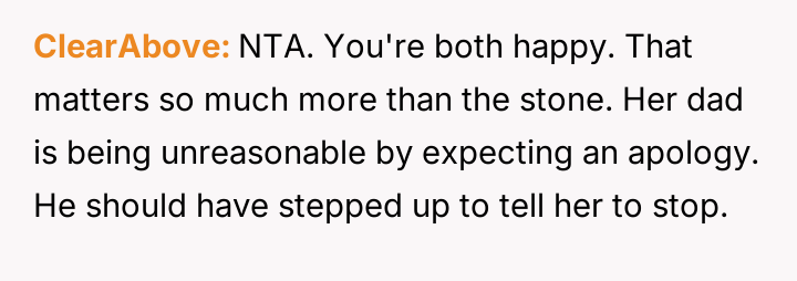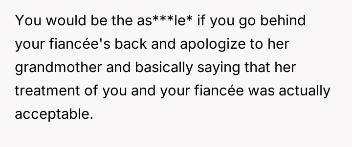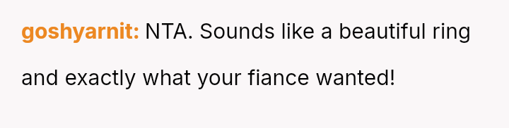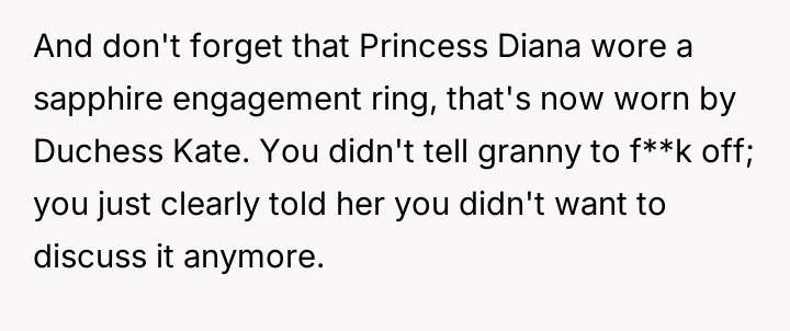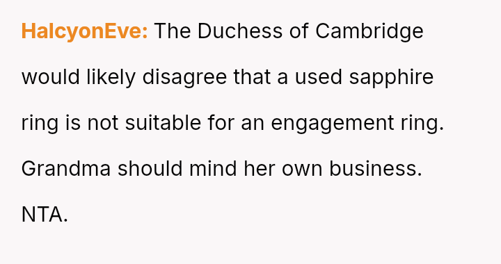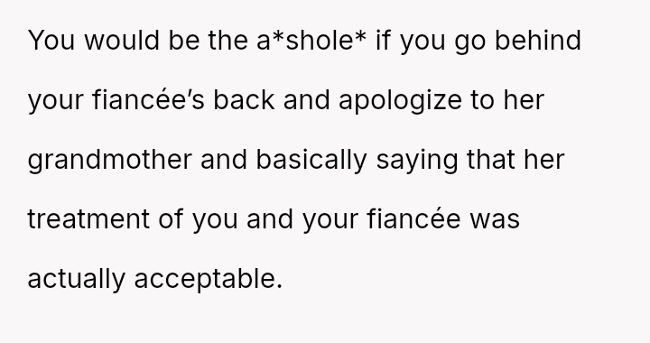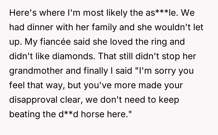 Given that the fiancée supports the OP and loves the ring, is the OP obligated to apologize to the grandmother merely to appease the fiancée's father and maintain superficial family peace, or is standing firm on the appropriateness of his loving choice the correct path?