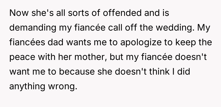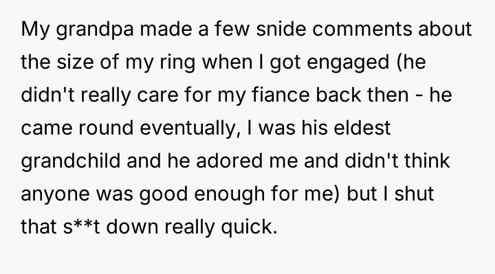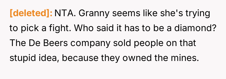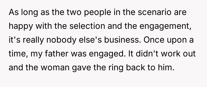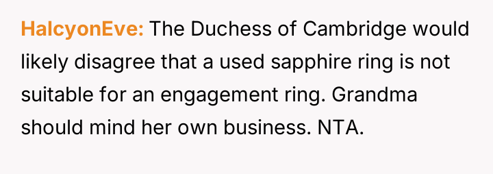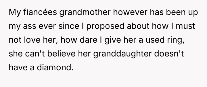 However, the fiancée's grandmother has strongly opposed this choice, focusing on the ring being pre-owned and not a diamond, leading to significant family tension and a demand for the wedding to be called off.
