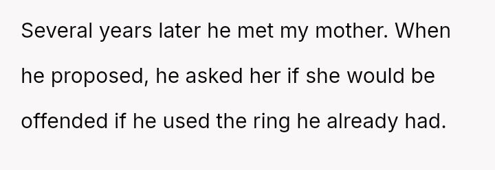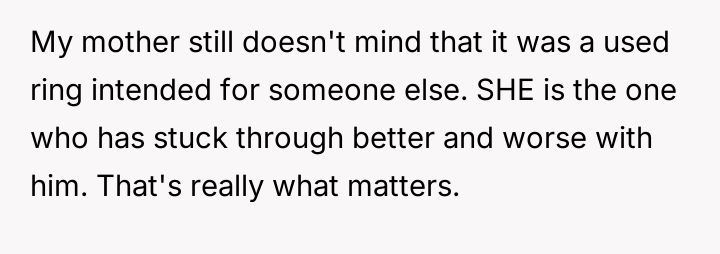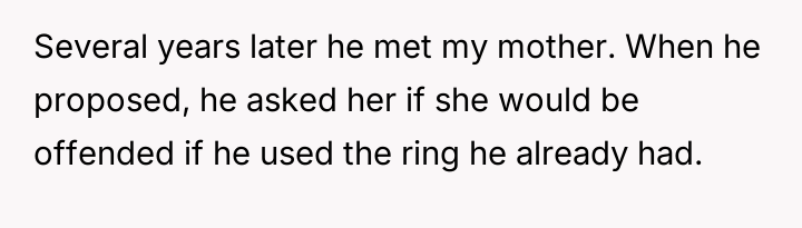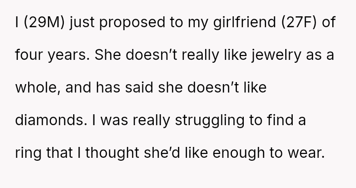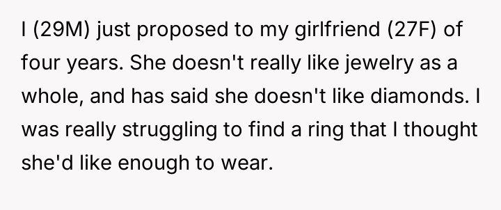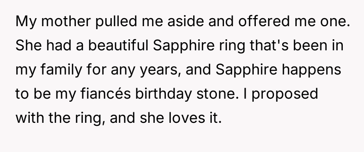 The original poster (OP) successfully proposed to his girlfriend using a meaningful family heirloom ring, which she genuinely loves.
