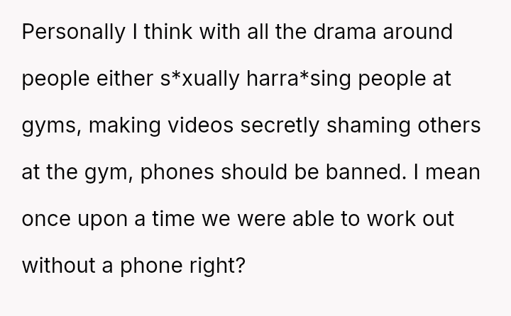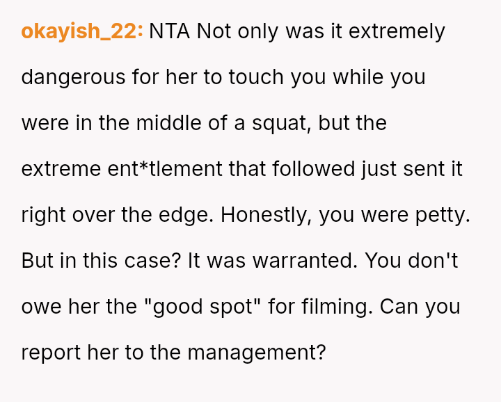 The original poster (OP) felt their focused workout routine was disrupted by another gym member who aggressively demanded they stop using a specific machine for a video recording.