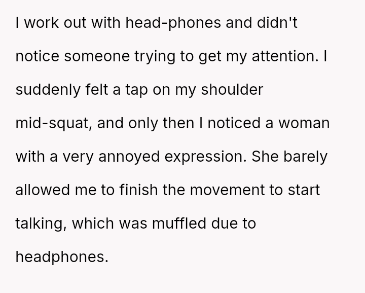In the midst of a squat, headphones in place, the sudden tap on the shoulder shattered the coc**n of concentration.