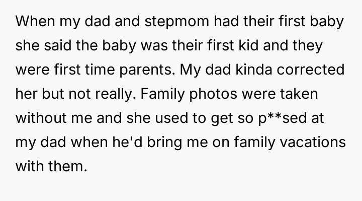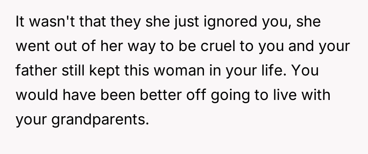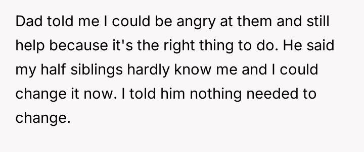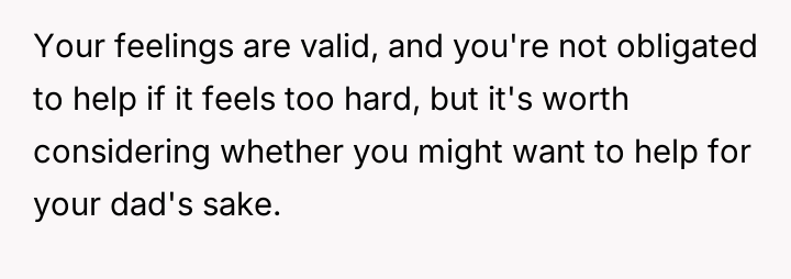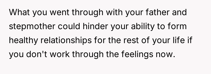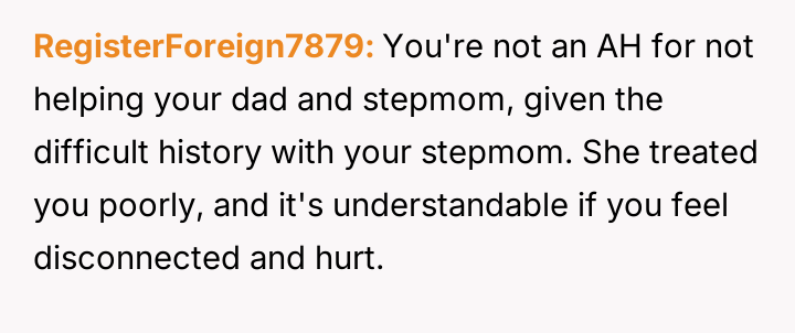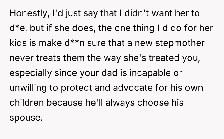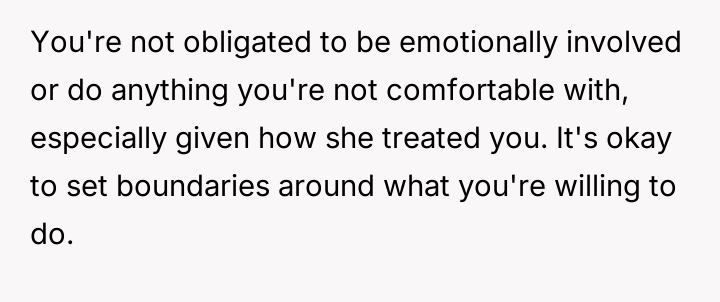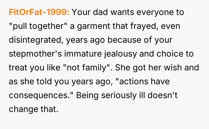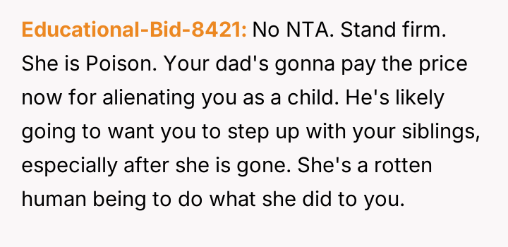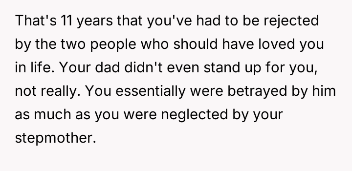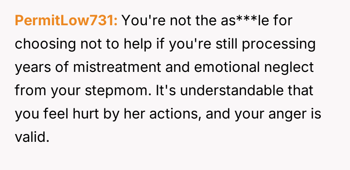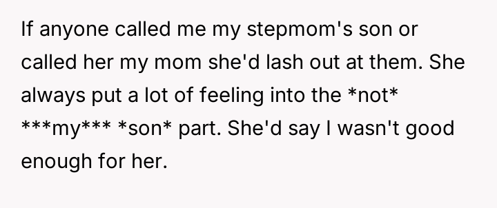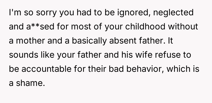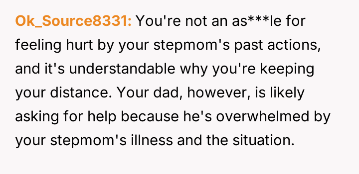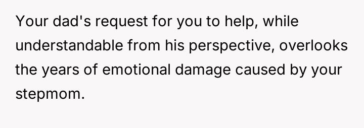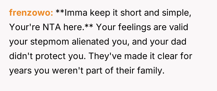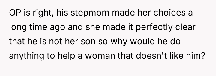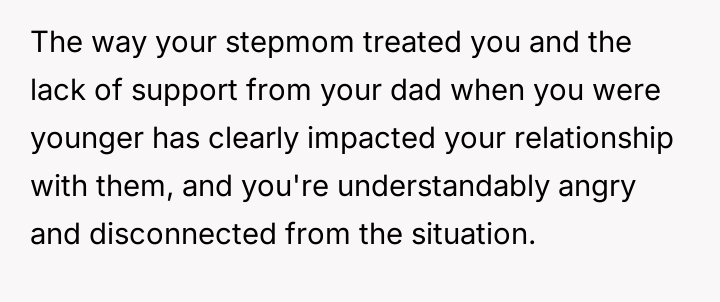 The original poster (OP) maintains a deeply conflicted and hurt emotional position rooted in years of rejection by his stepmother, who explicitly excluded him from the family unit.