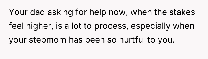 Should the OP prioritize his personal history of rejection and his plans for independence, or is the ethical obligation to help his father and younger siblings during a medical crisis, even if it means temporarily setting aside resentment toward the stepmother?
