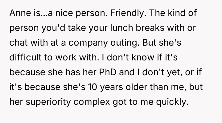 Then came Anne, a seasoned postdoctoral associate whose friendly demeanor masked the challenging undercurrents of their collaboration.