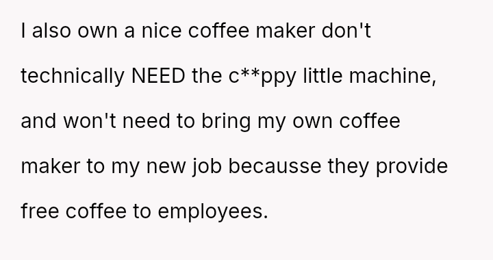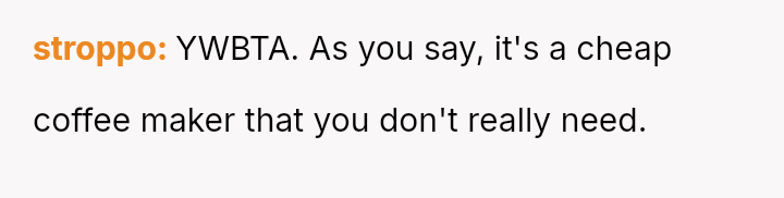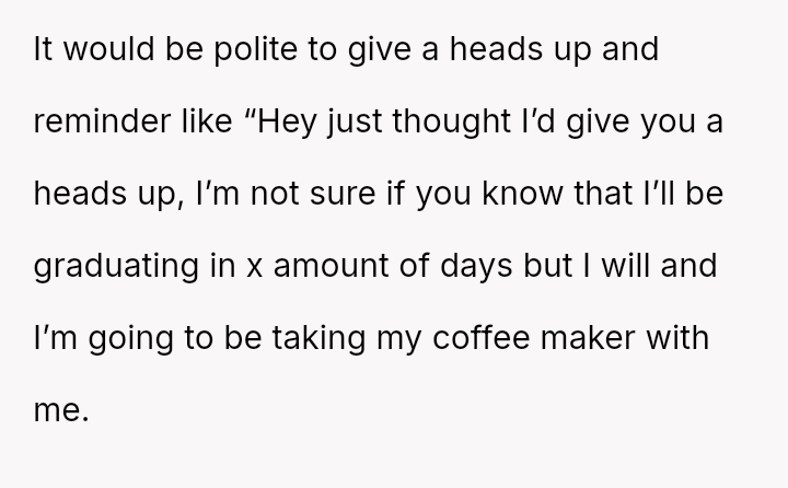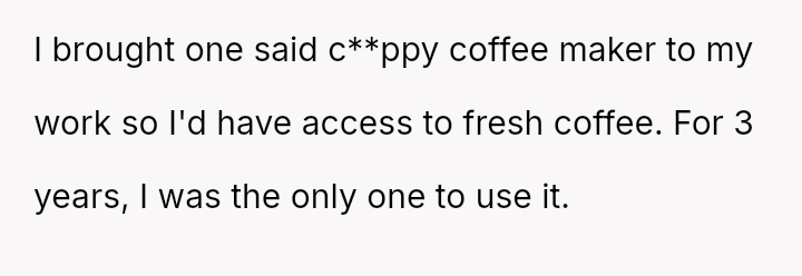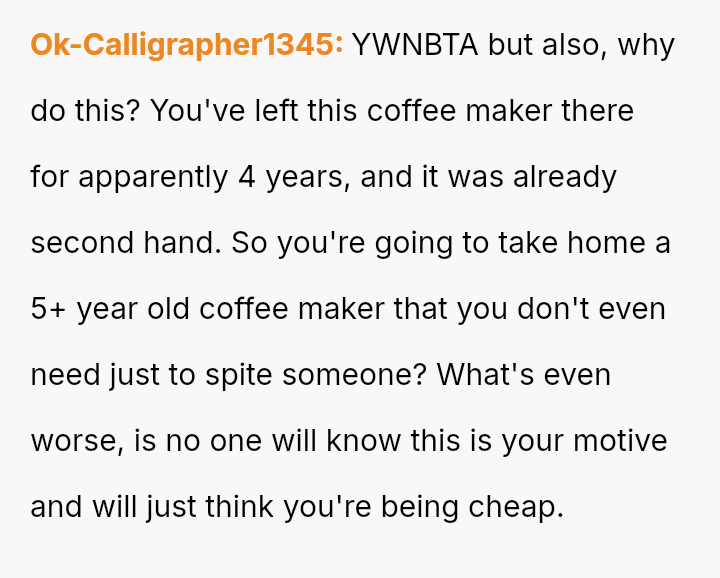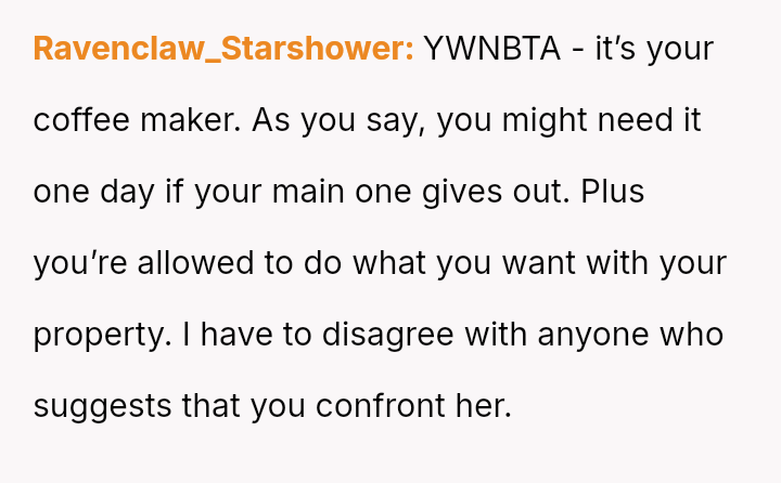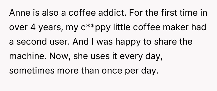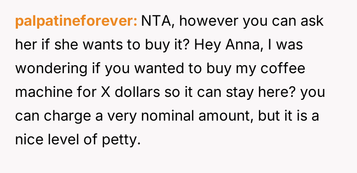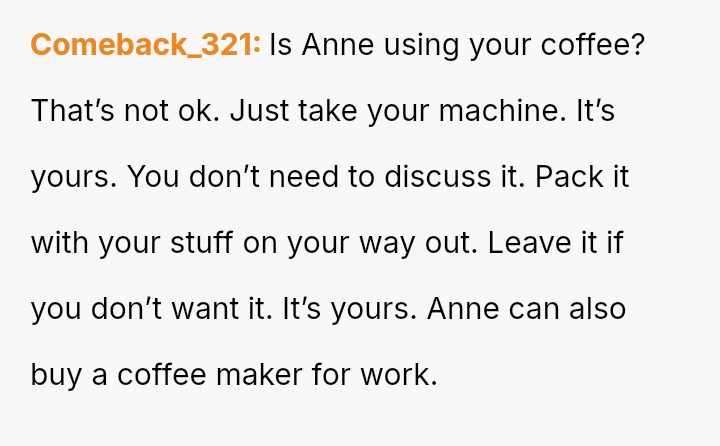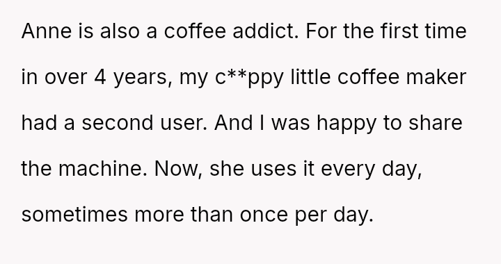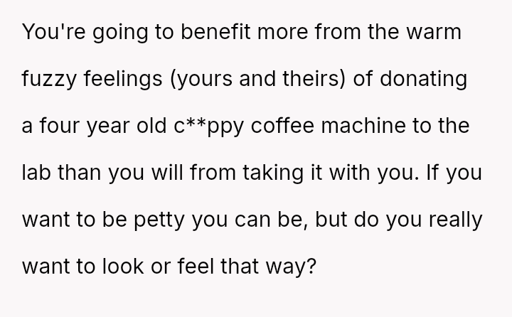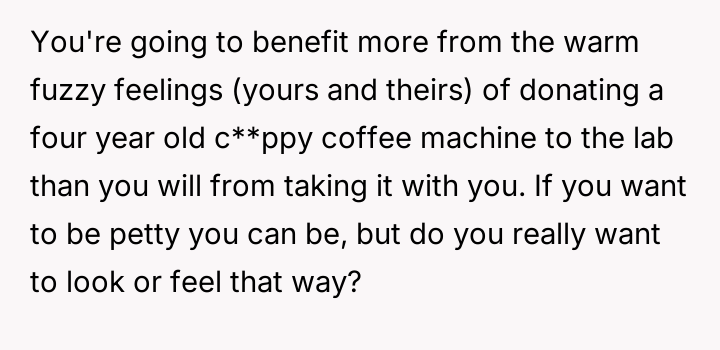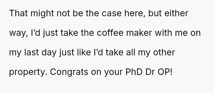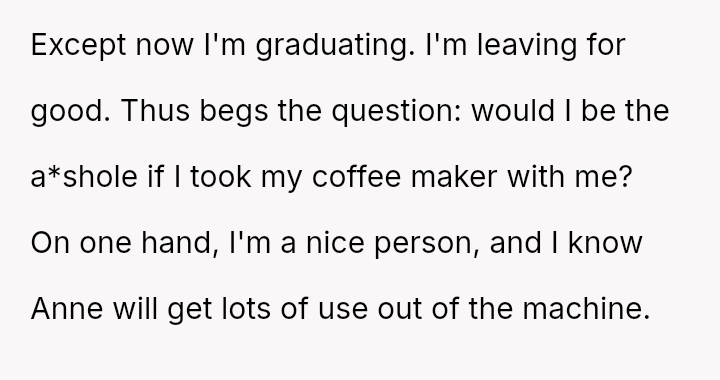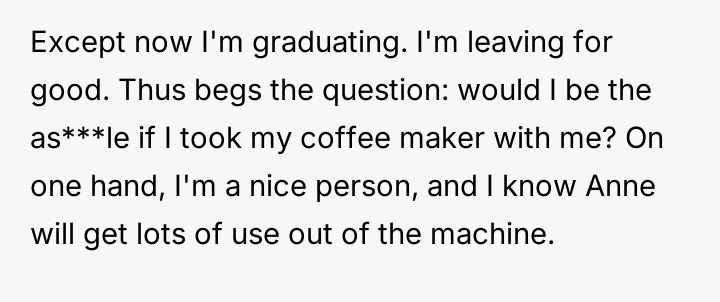 The original poster (OP) is facing a dilemma regarding whether to take a personal, older coffee maker upon leaving their PhD program, especially since a difficult colleague, Anne, has become dependent on it.