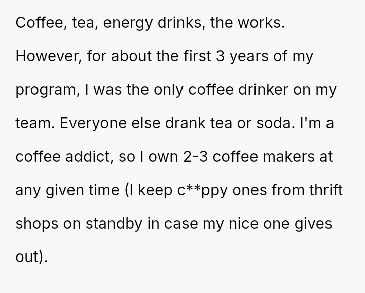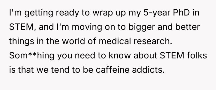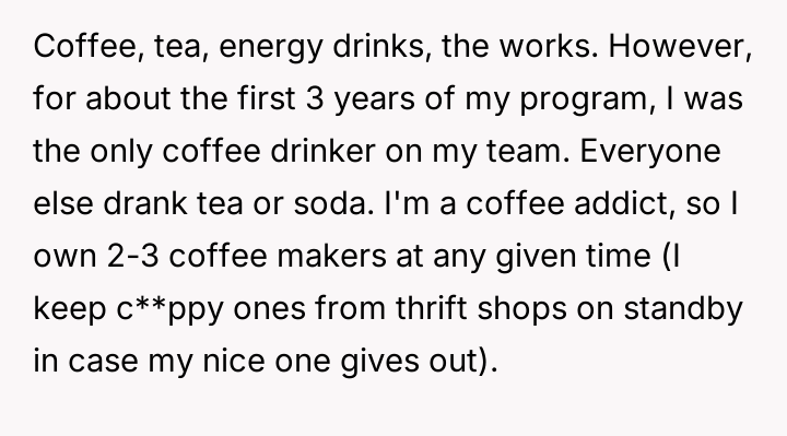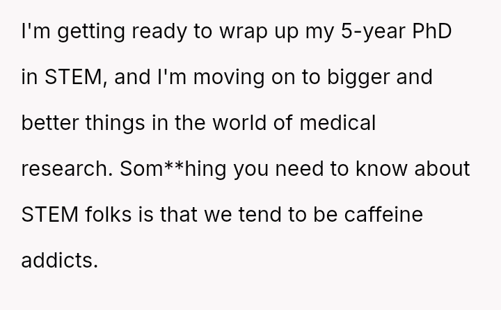 For five relentless years, a solitary coffee addict navigated the demanding world of STEM, clinging to the comfort of her trusty, secondhand coffee makers while surrounded by tea and soda drinkers.