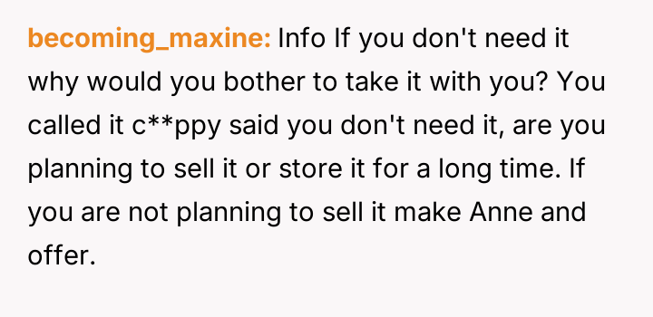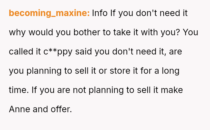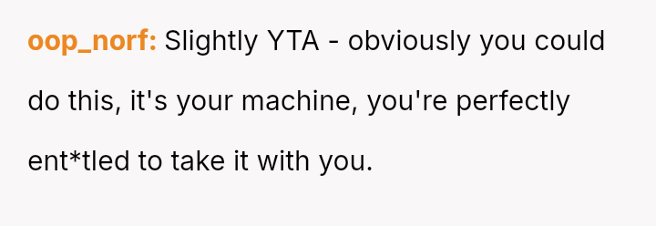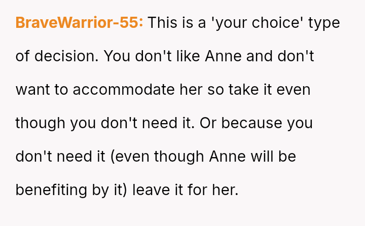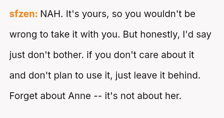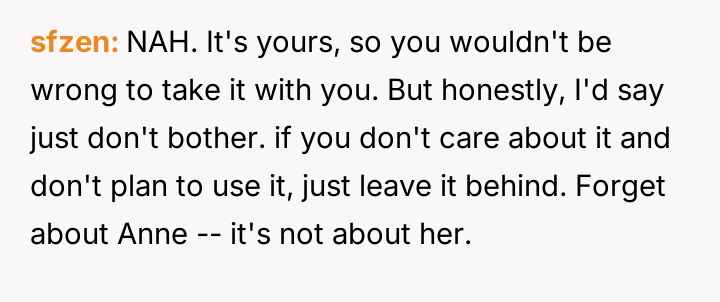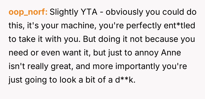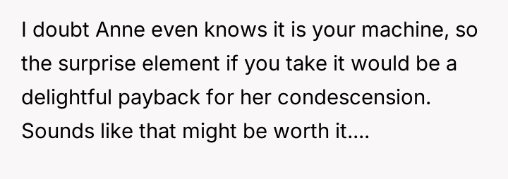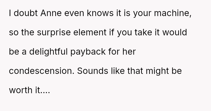If the OP takes the machine, they prioritize their own comfort and slight retribution for past frustrations; if they leave it, they act graciously despite Anne's negative contributions.