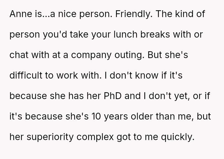 Then came Anne, a seasoned postdoctoral a*sociate whose friendly demeanor masked the challenging undercurrents of their collaboration.