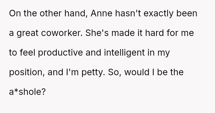 The conflict centers on the OP's desire to be generous versus a feeling of resentment stemming from Anne's challenging workplace behavior and perceived lack of respect.