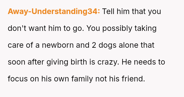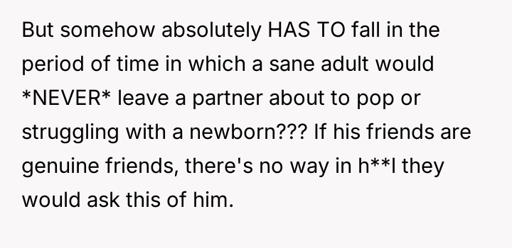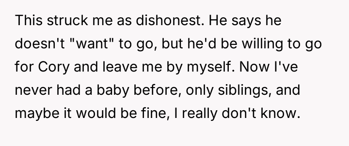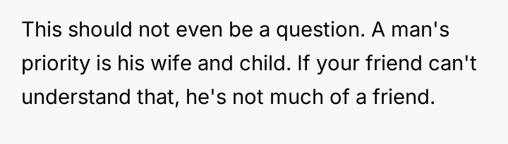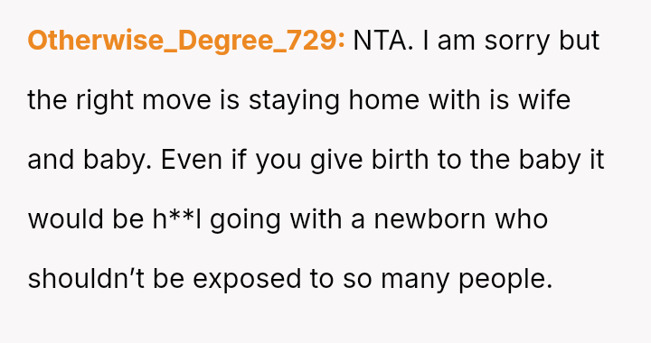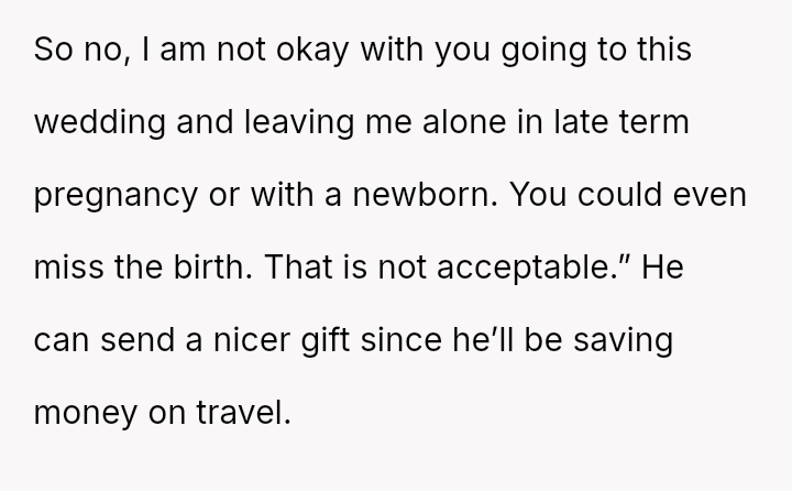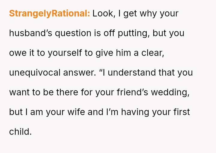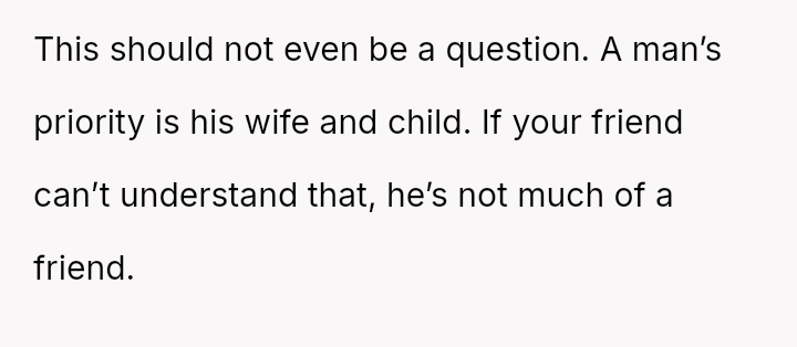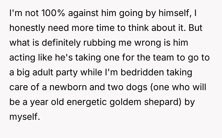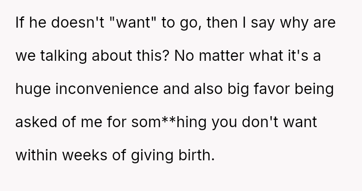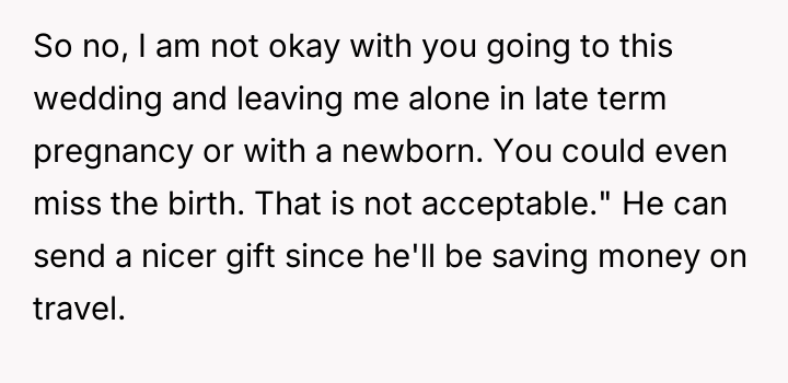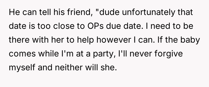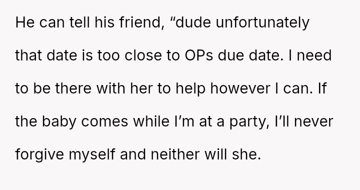 Given the near-term due date, the core question is whether the husband's commitment to his friend ethically overrides the pr****nt wife's need for security and primary support during her most vulnerable time, or if his willingness to attend alone, unsupported by his wife, necessitates a firm boundary based on the imminent birth?