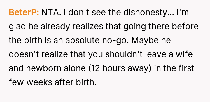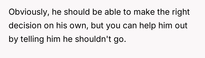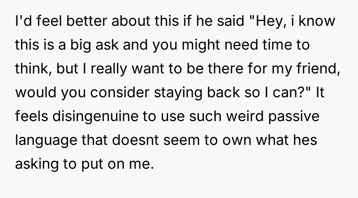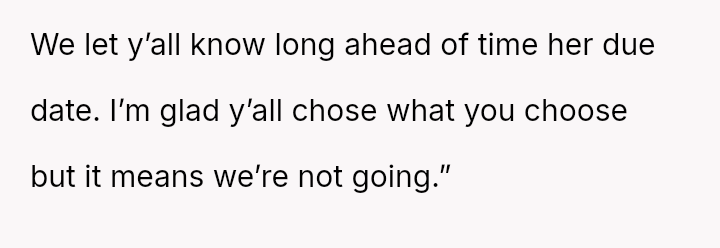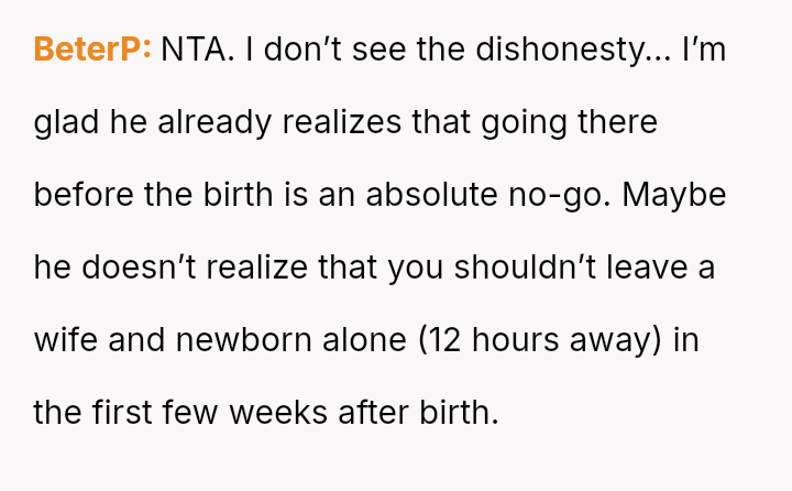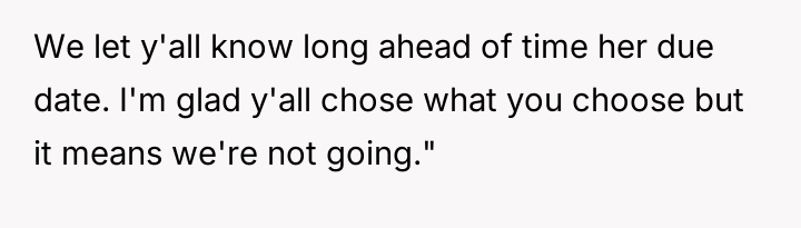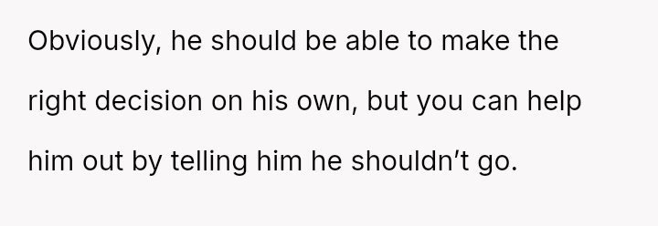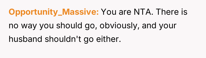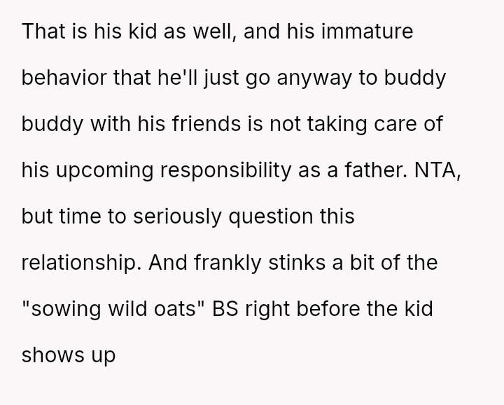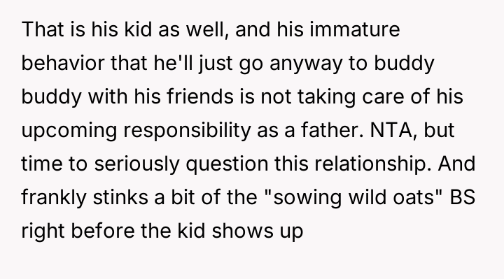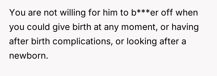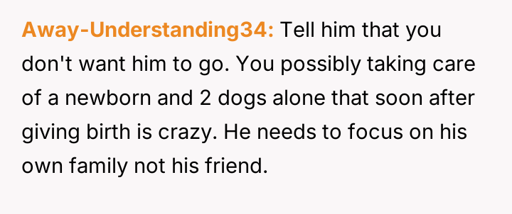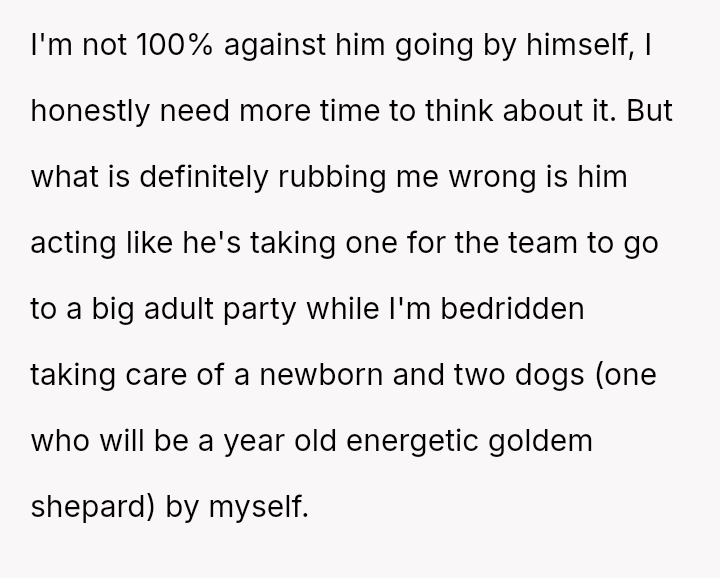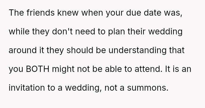 Given the near-term due date, the core question is whether the husband's commitment to his friend ethically overrides the pr****nt wife's need for security and primary support during her most vulnerable time, or if his willingness to attend alone, unsupported by his wife, necessitates a firm boundary based on the imminent birth?