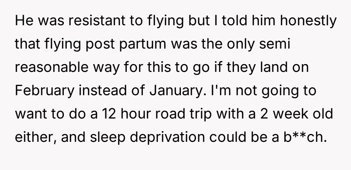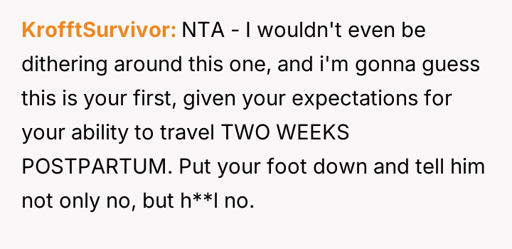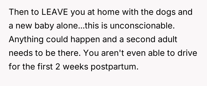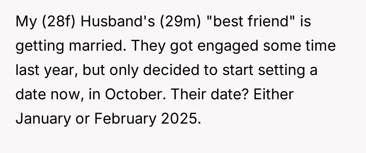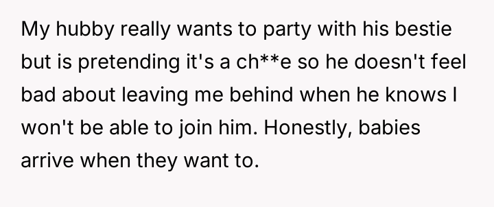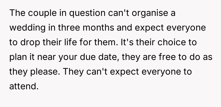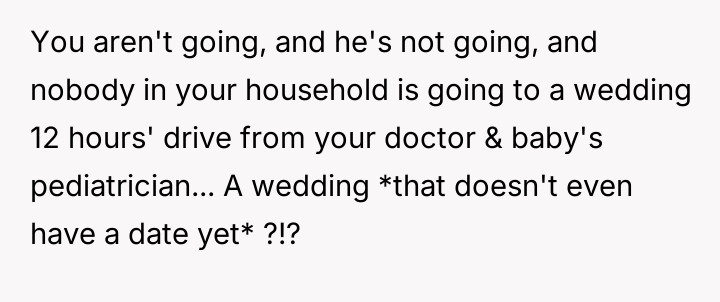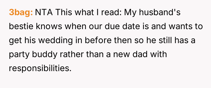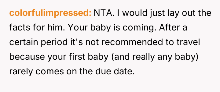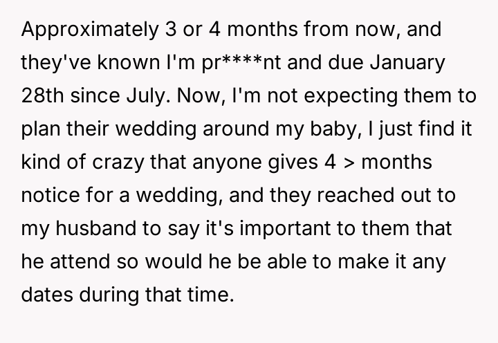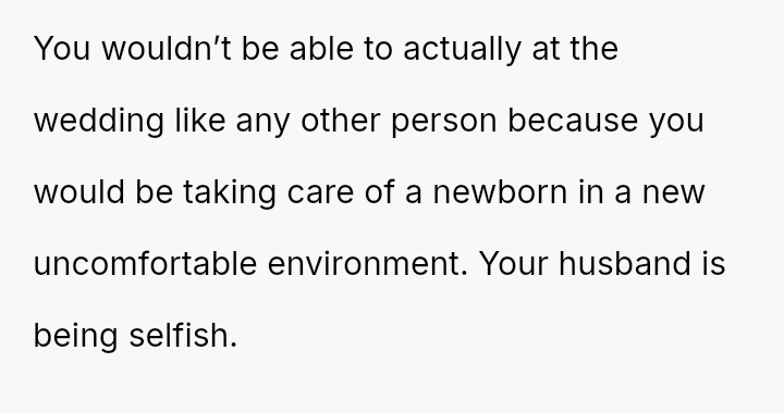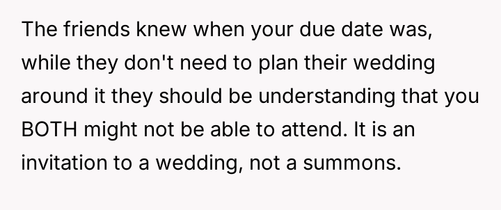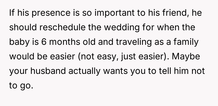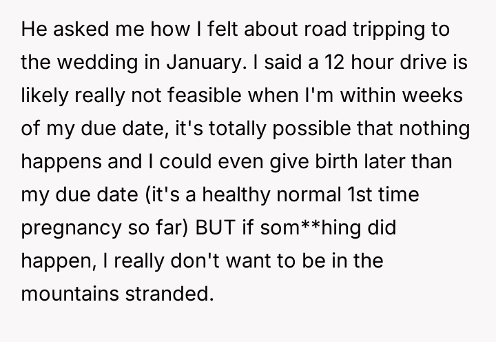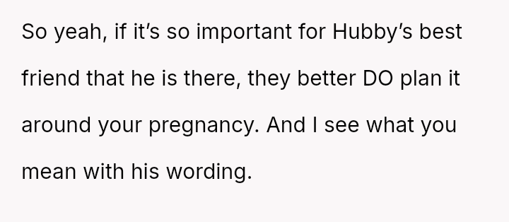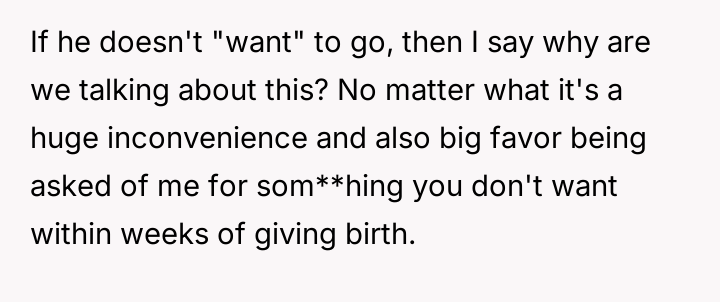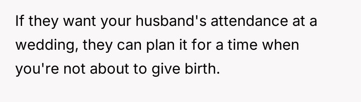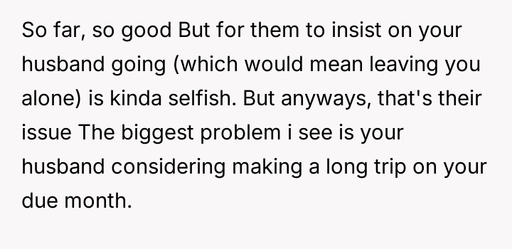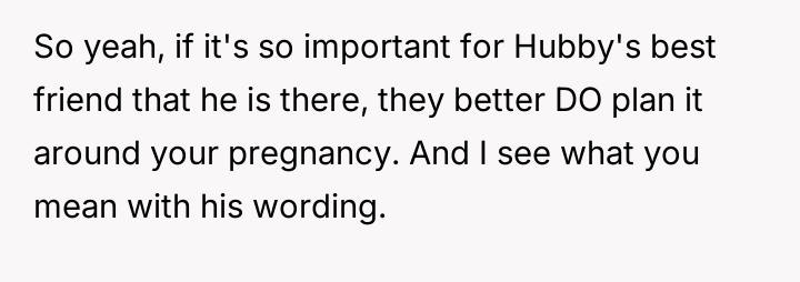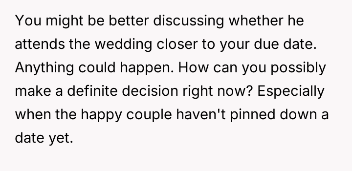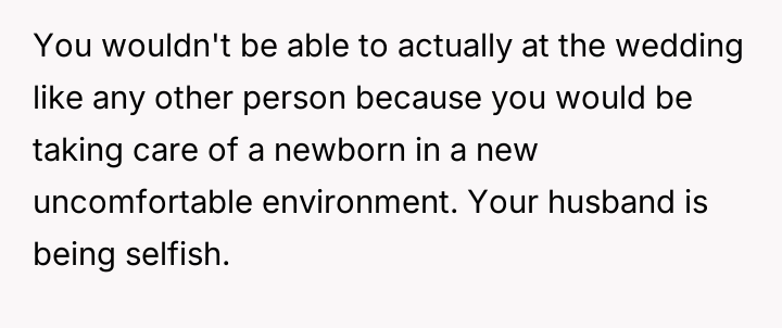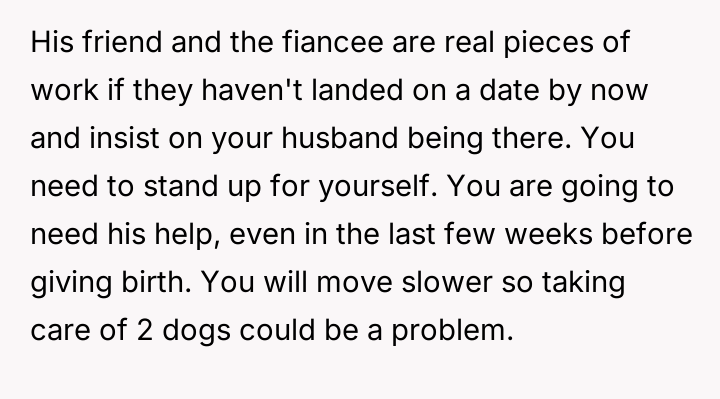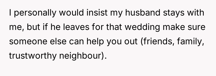 The original poster is facing a significant conflict between her husband's desire to attend his best friend's wedding and the practical, physical realities of being weeks away from a first-time delivery, compounded by feeling unsupported regarding the necessary childcare and travel logistics.