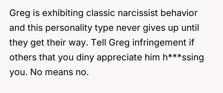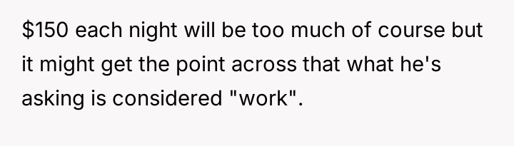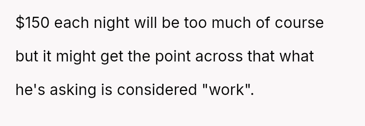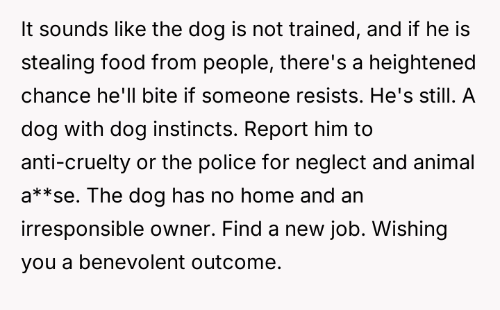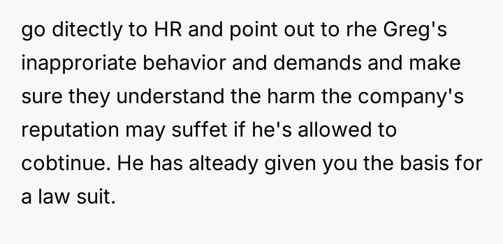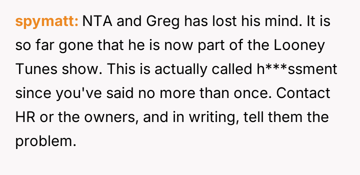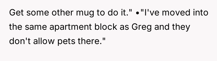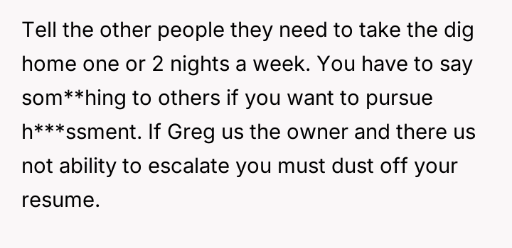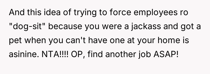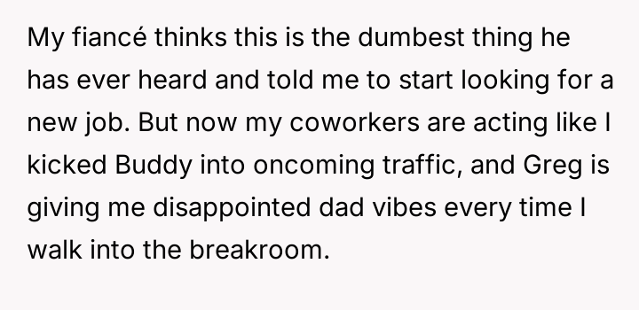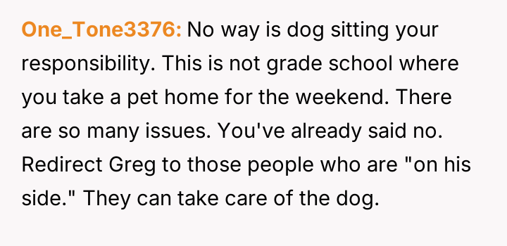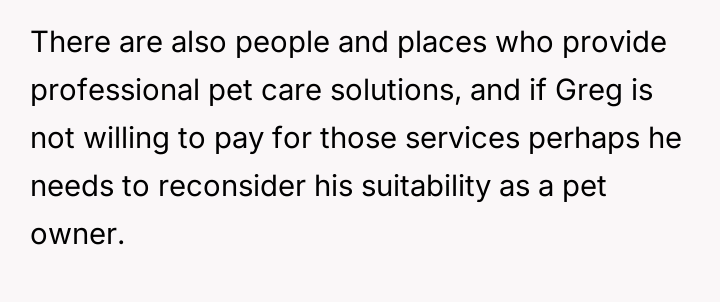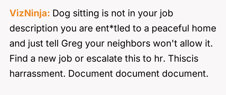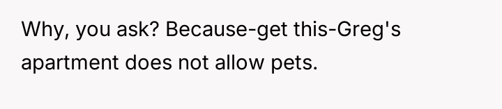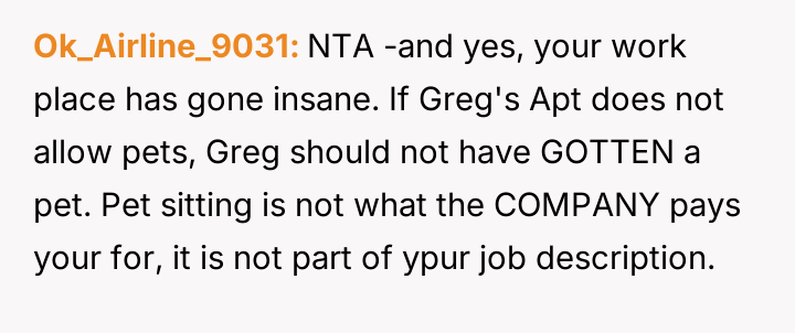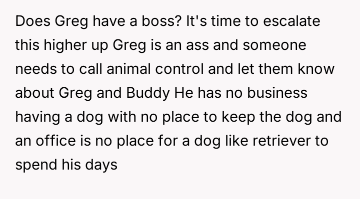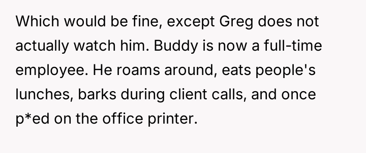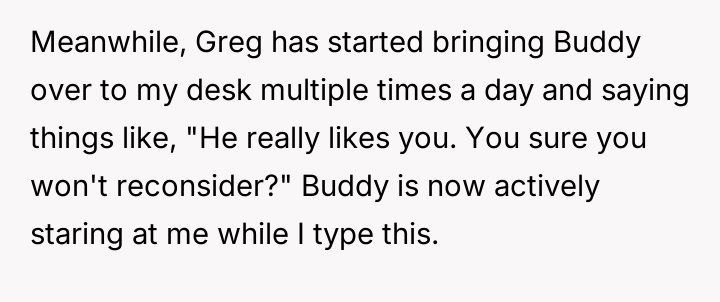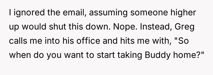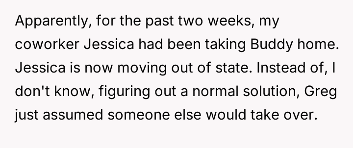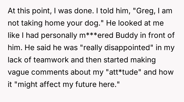 When Greg's apartment lease changed, he immediately expected an employee to take over caring for Buddy overnight, leading to the boss directly pressuring the narrator to comply, which she refused, resulting in workplace tension and subtle threats to her job security.