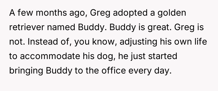 The conflict began when Greg adopted a golden retriever named Buddy and started bringing him to the office daily without managing the dog's behavior, leading to disruption.