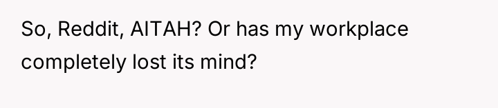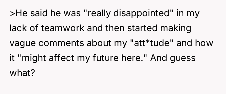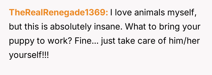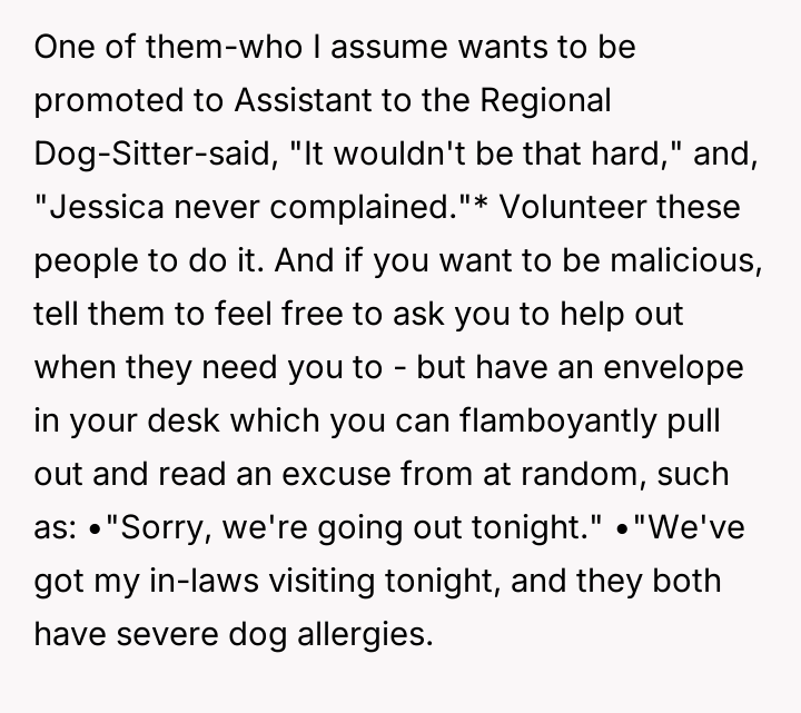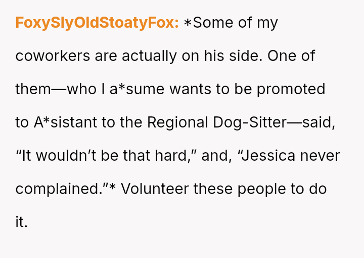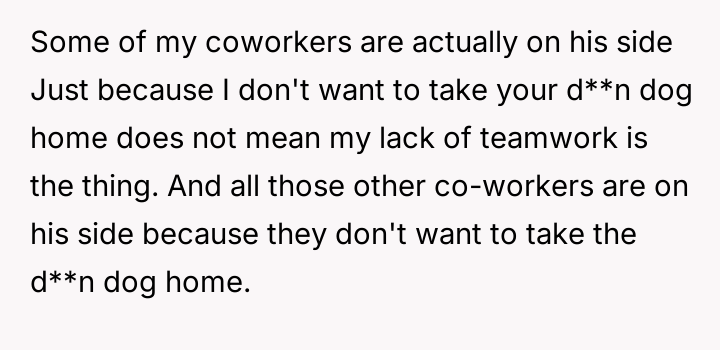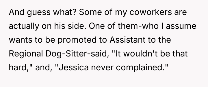 The narrator finds herself in a difficult position where her reasonable boundary—refusing to take on the responsibility of her boss's pet—is being framed by management as a failure of teamwork and loyalty.