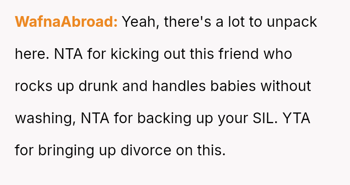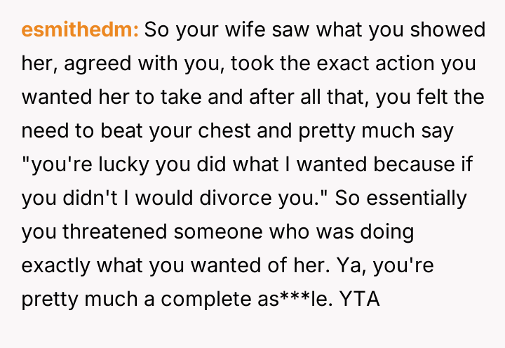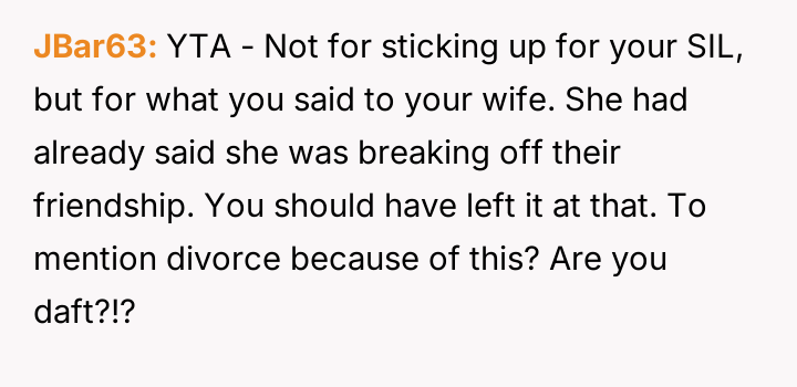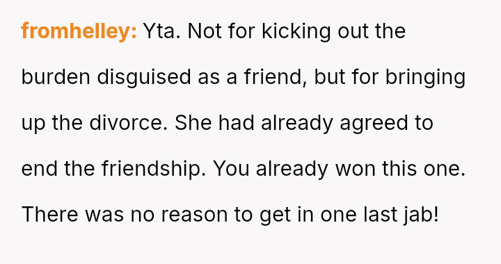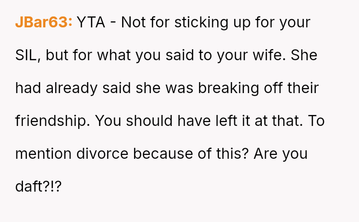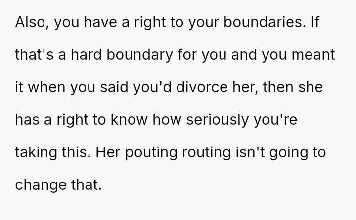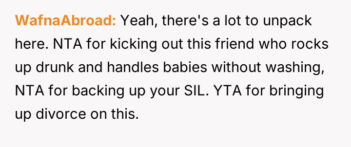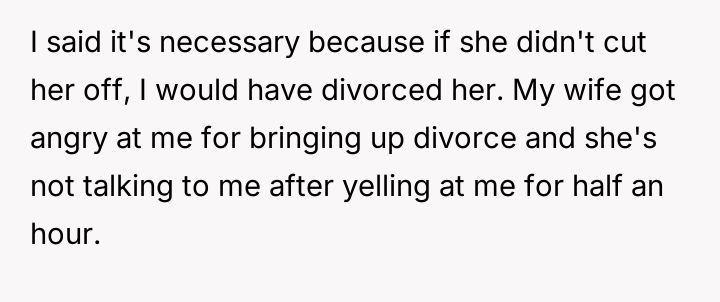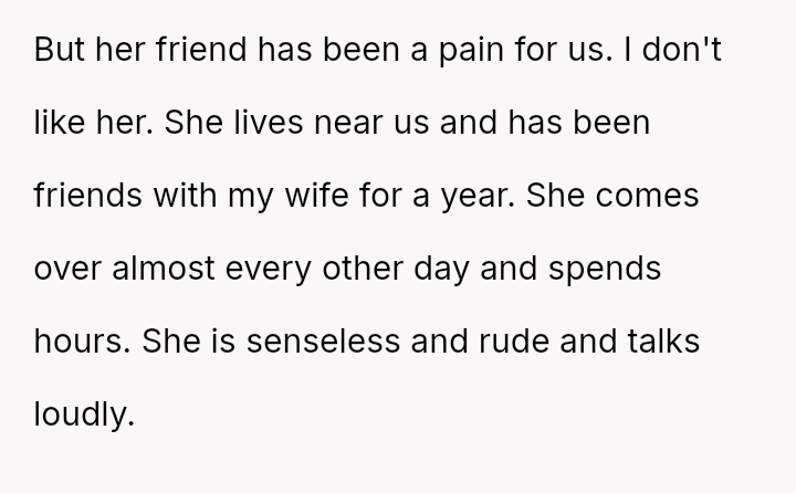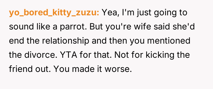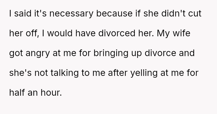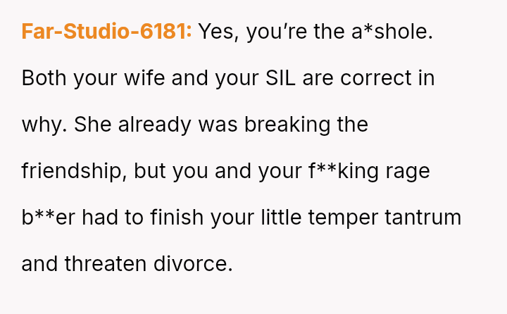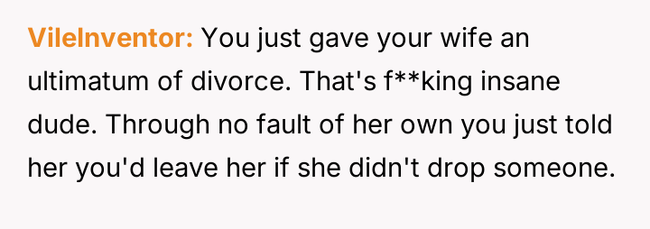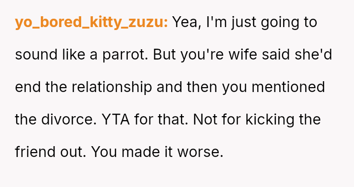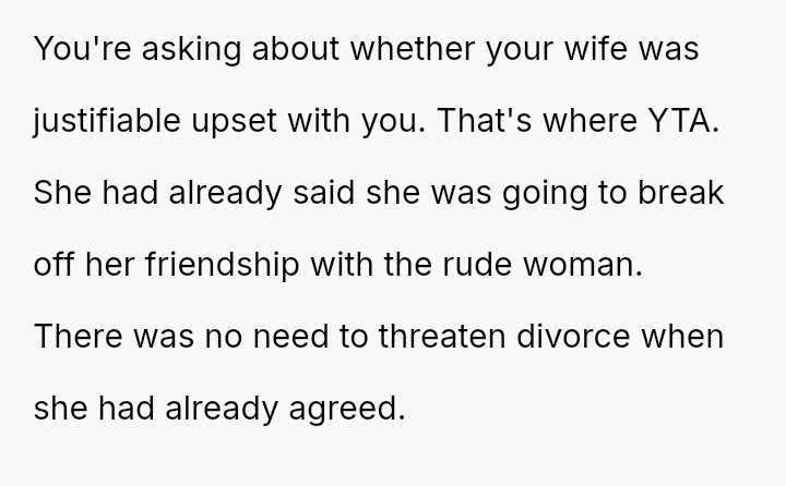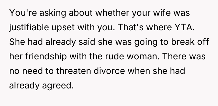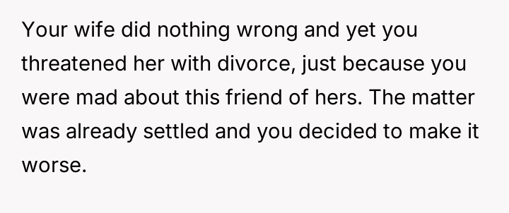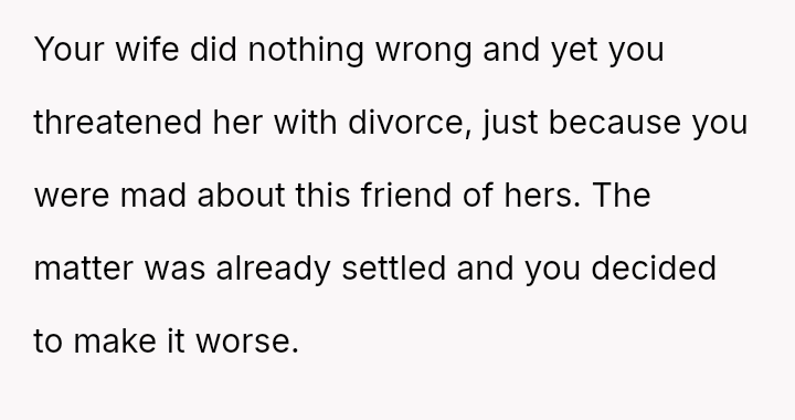 However, the conflict escalated when the OP introduced the threat of divorce to enforce their boundary regarding the friendship, causing significant marital strain despite the friend's unacceptable actions.