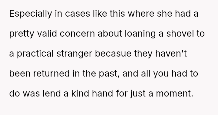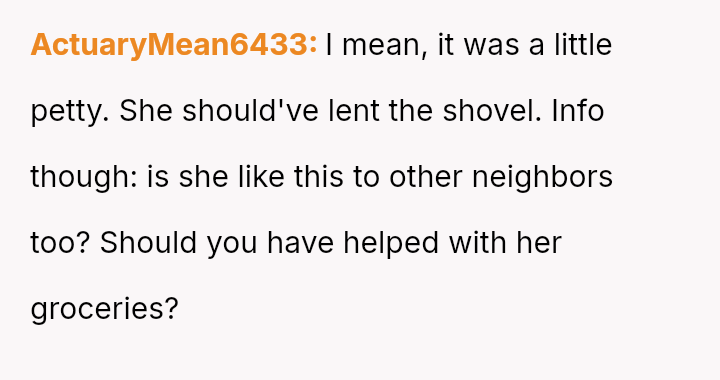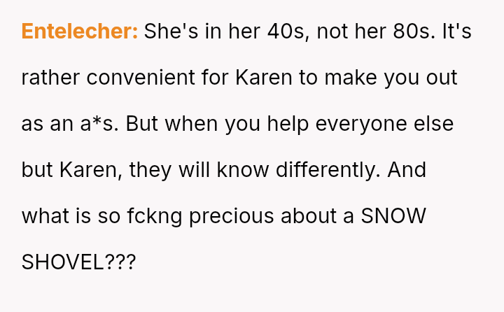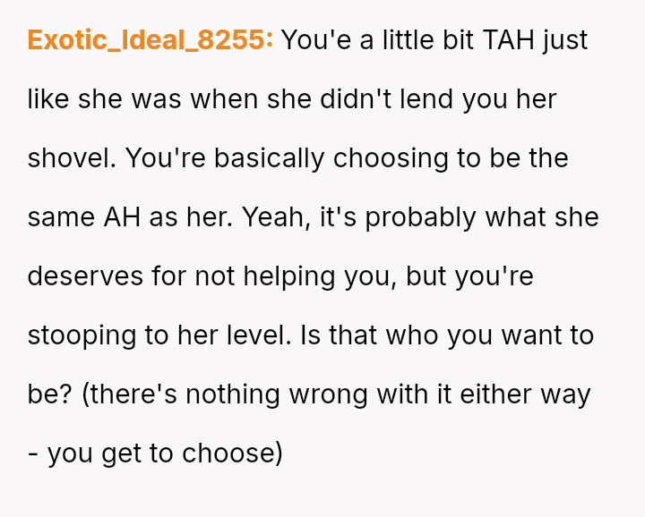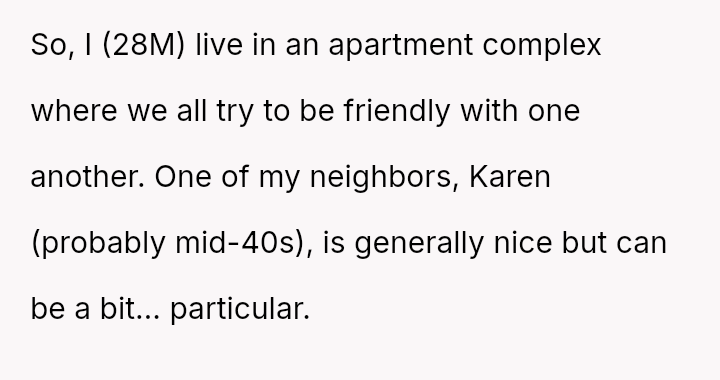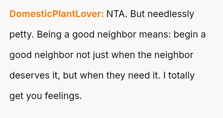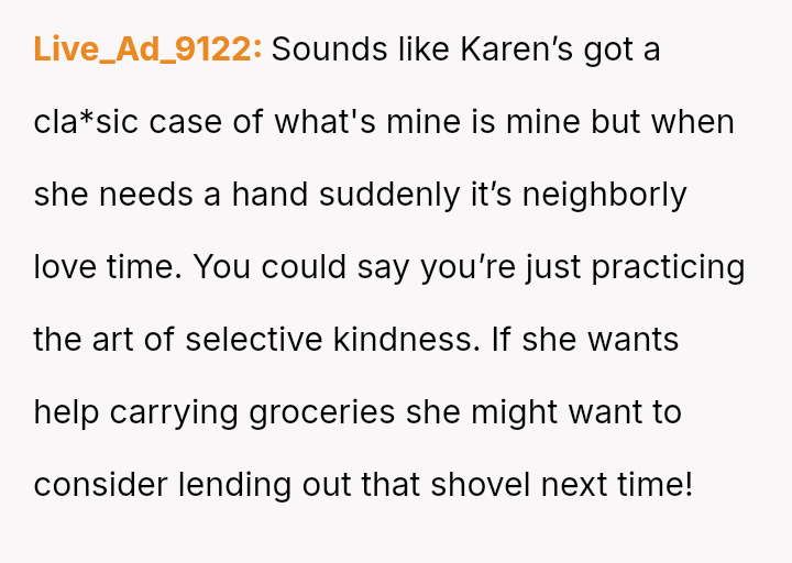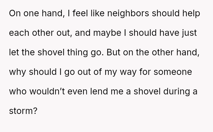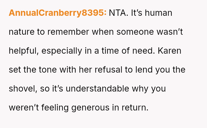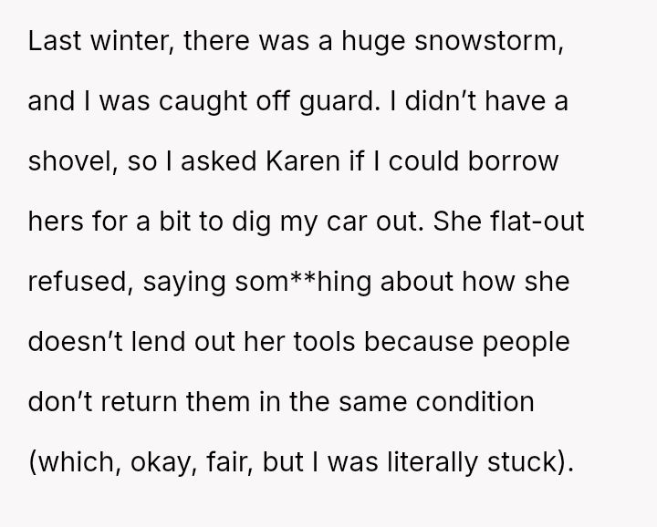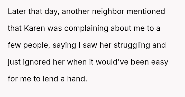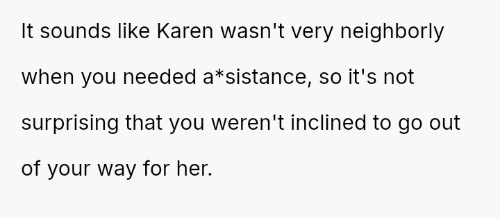 The original poster (OP) is facing a conflict rooted in a perceived imbalance of neighborly reciprocity, feeling justified in their decision not to a*sist Karen after she previously refused a simple request for help.