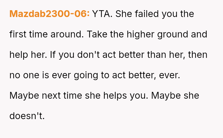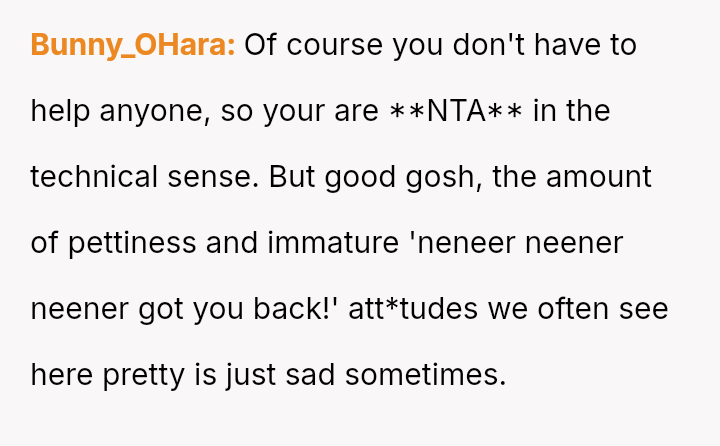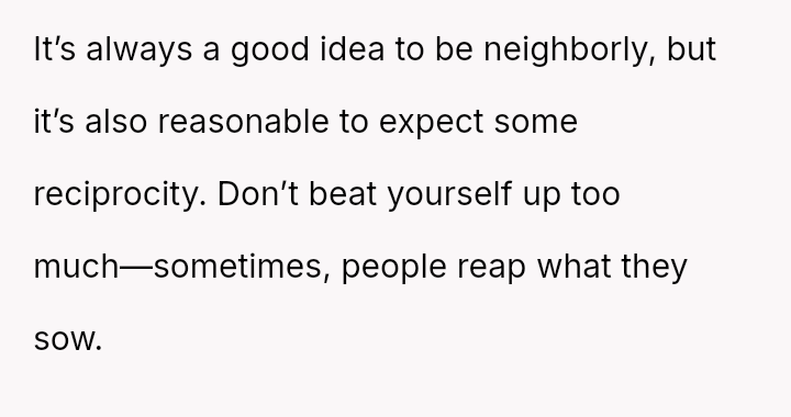 Should individuals prioritize generalized neighborly kindness regardless of past slights, or is it acceptable to withhold a*sistance as a direct consequence of another person's lack of cooperation when help was needed?