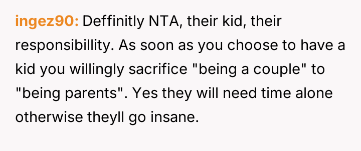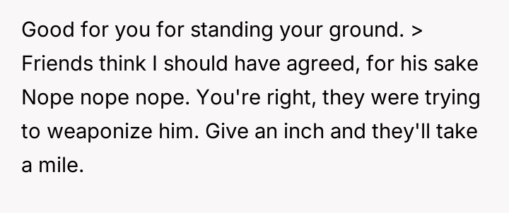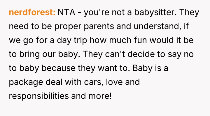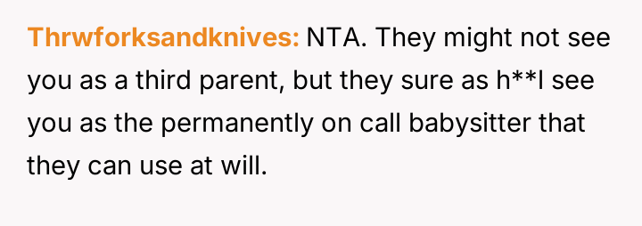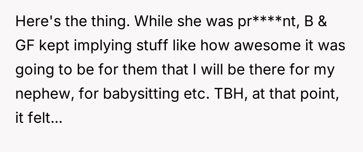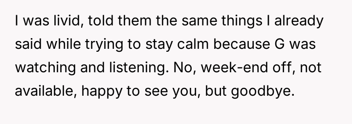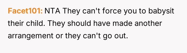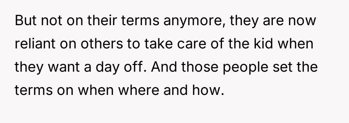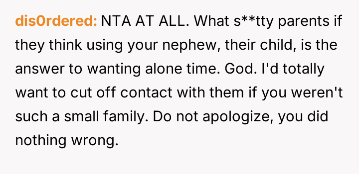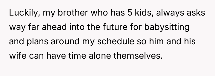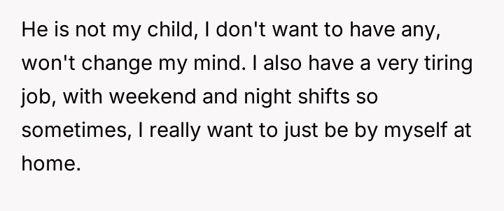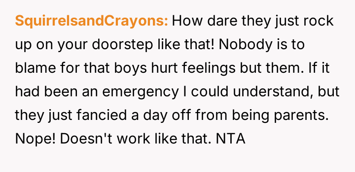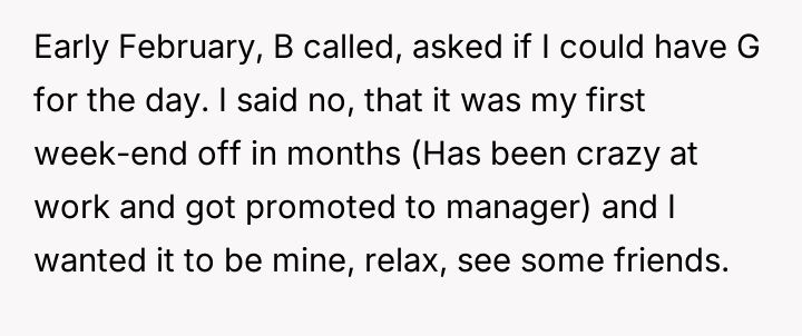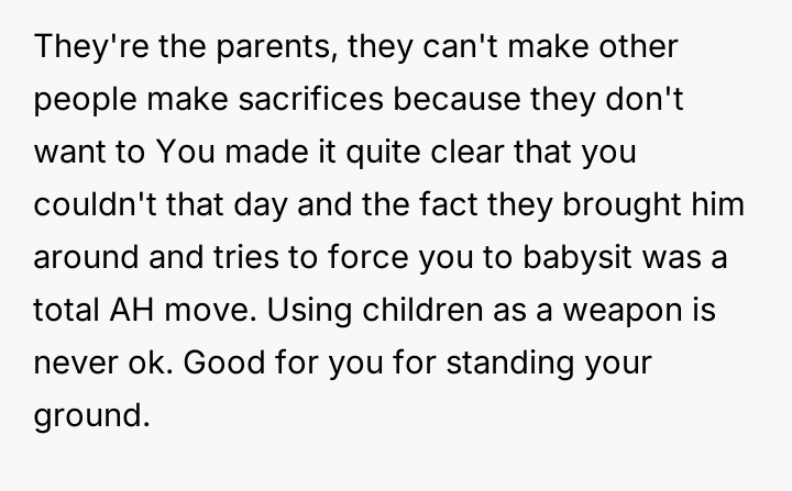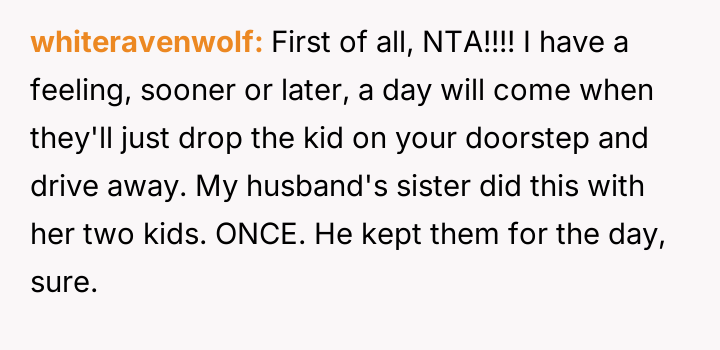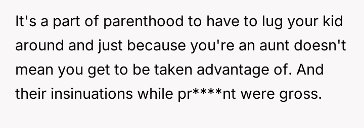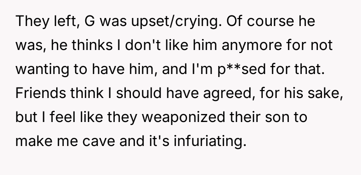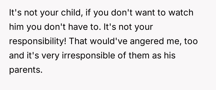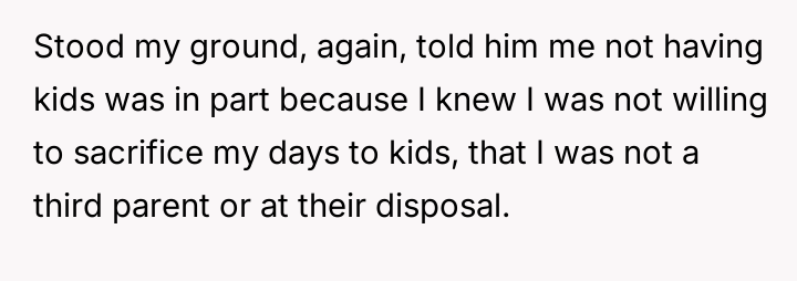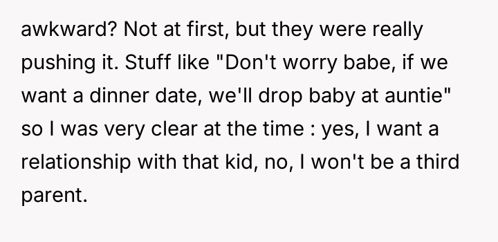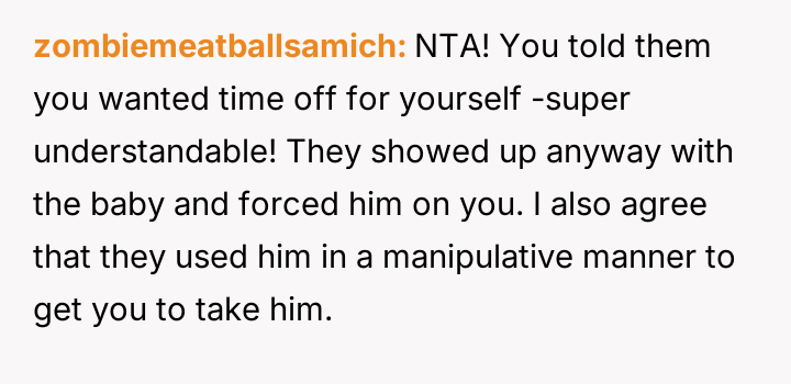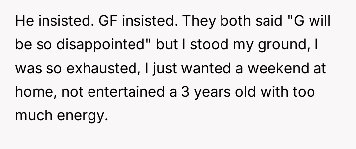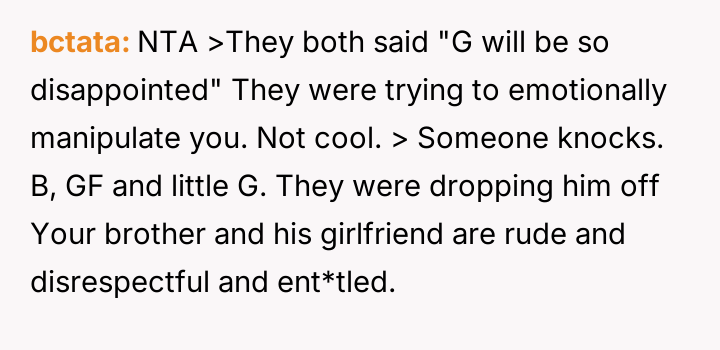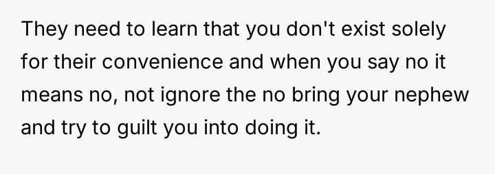 Her brother and his partner actively disregarded her prior explicit limits, escalating the situation by physically dropping off the child when she refused their last-minute request.