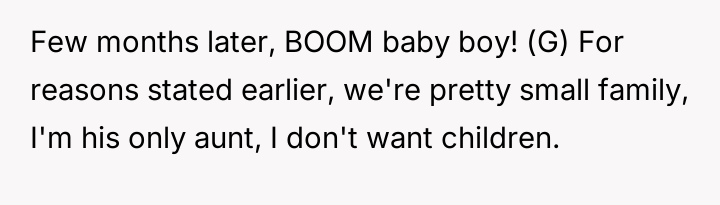 As the sole aunt to her brother’s newborn son, she embraces her role with warmth, yet stands firm against being thrust into unwanted parental duties, longing for respect in her chosen limits.