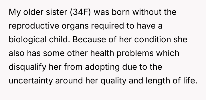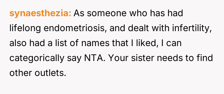 The original poster (OP) is facing a difficult situation where their sister, who cannot have children due to medical reasons, strongly desires a significant role in naming the OP's first baby.