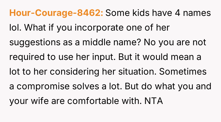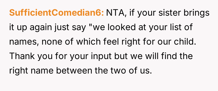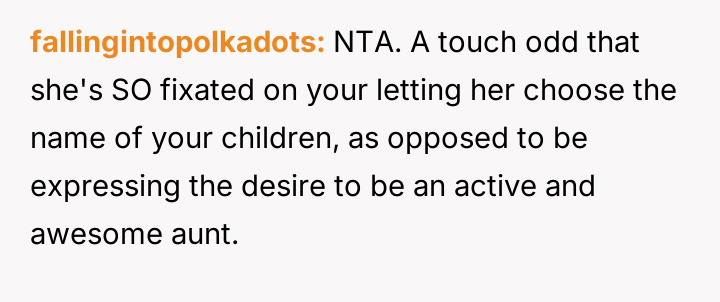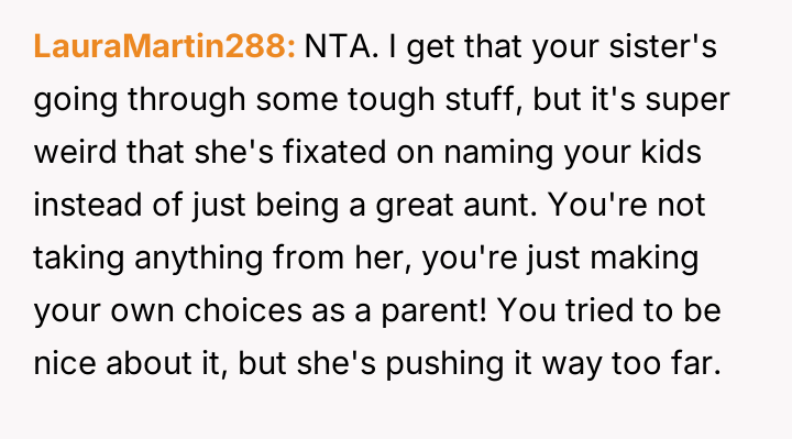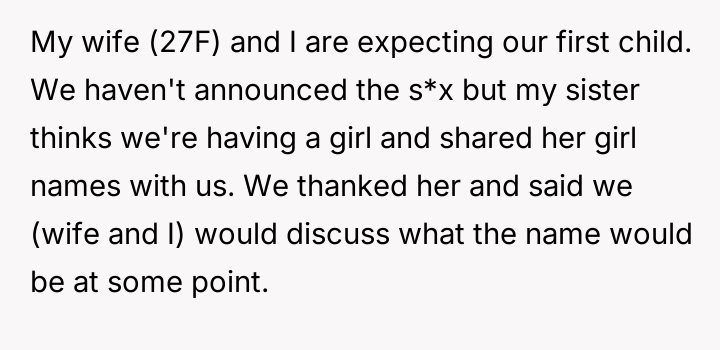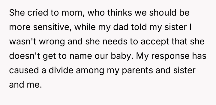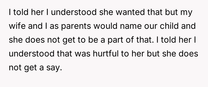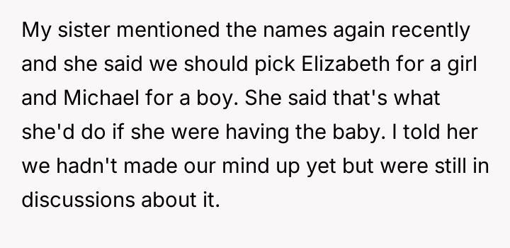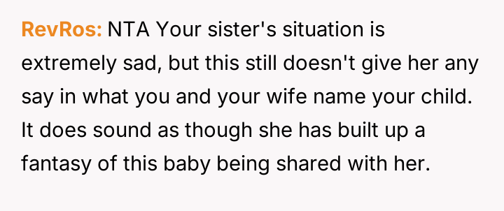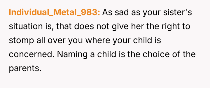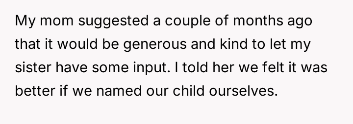 The central conflict arises from the OP and his wife's desire to maintain full autonomy over naming their child, which directly clashes with the sister's deeply felt, unmet longing for motherhood, leading to emotional distress for the sister and accusations of lacking compassion from the mother.