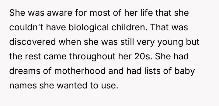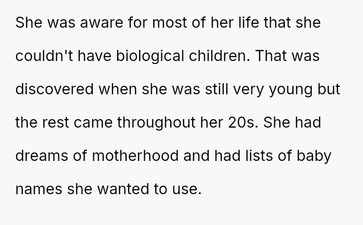 Born without the organs to bear children and barred from adoption due to health uncertainties, her dreams of nurturing life were carefully tucked away alongside lists of cherished baby names, symbols of a future she hoped to one day share.