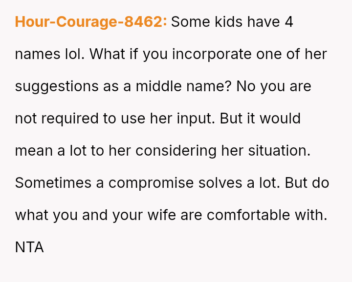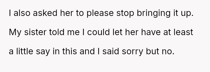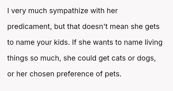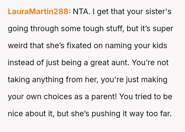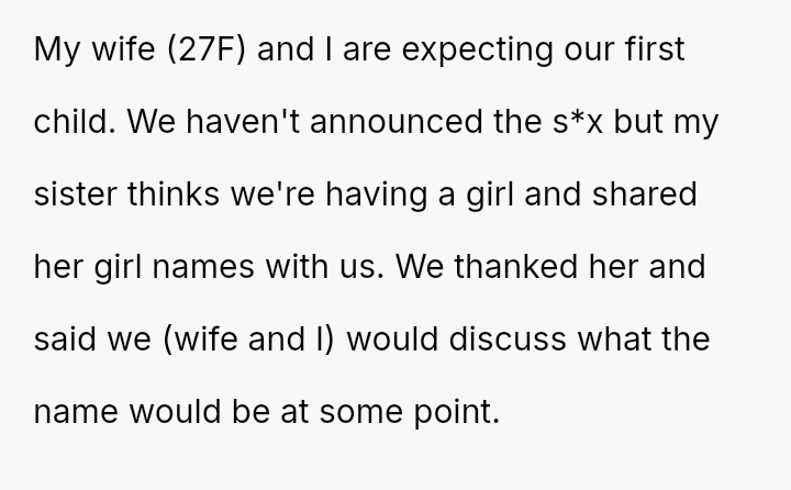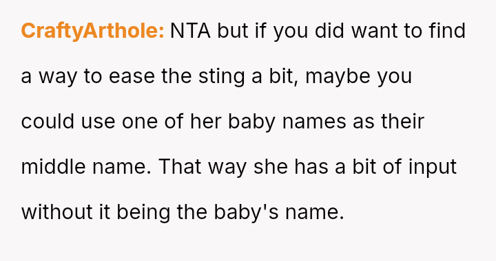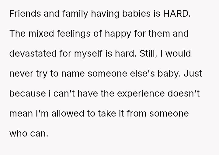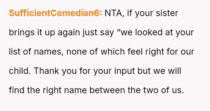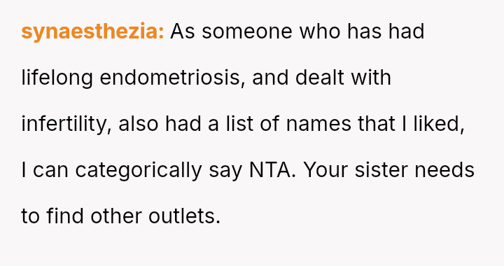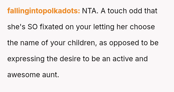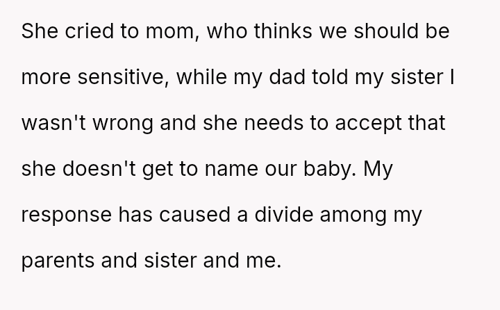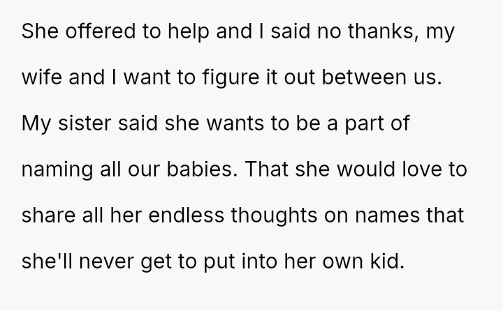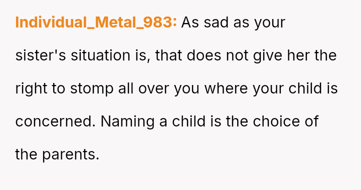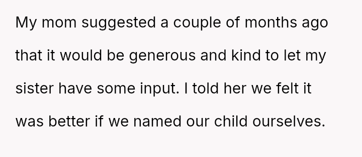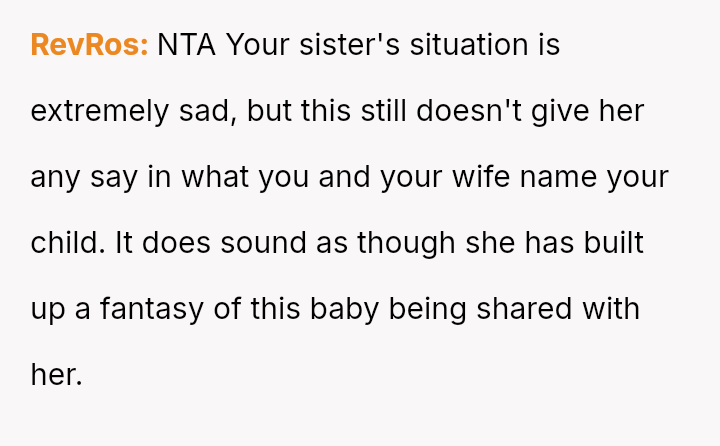 The central conflict arises from the OP and his wife's desire to maintain full autonomy over naming their child, which directly clashes with the sister's deeply felt, unmet longing for motherhood, leading to emotional distress for the sister and accusations of lacking compa*sion from the mother.