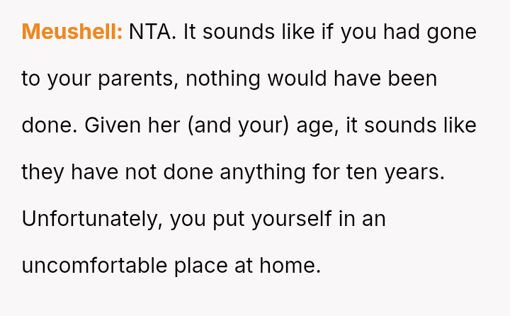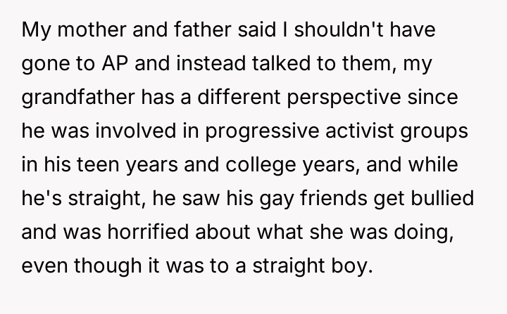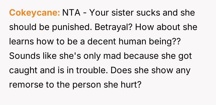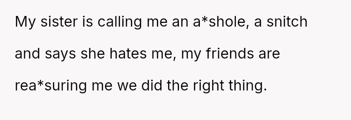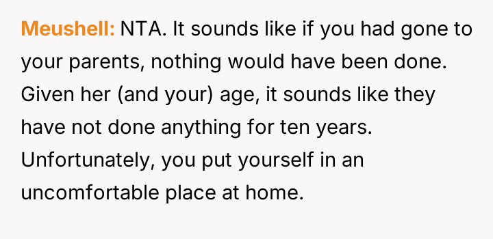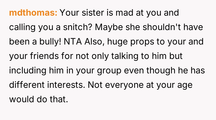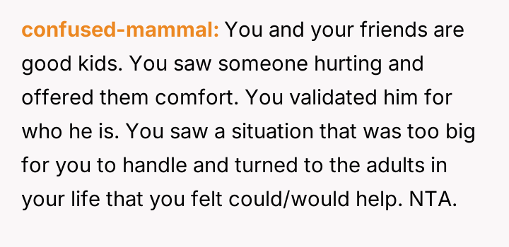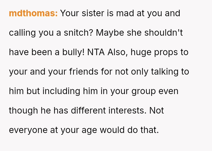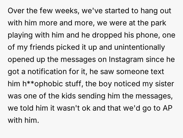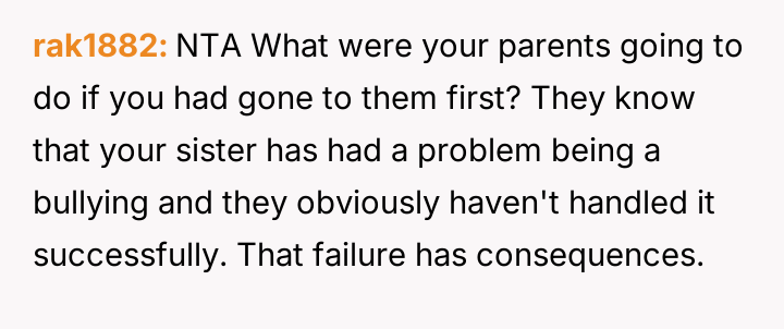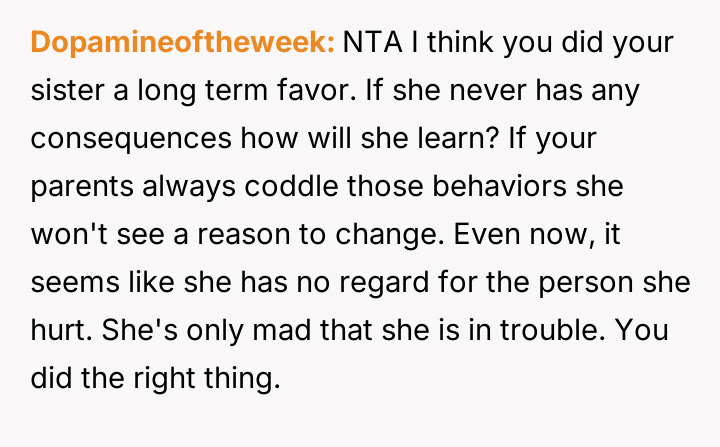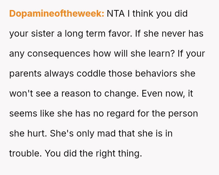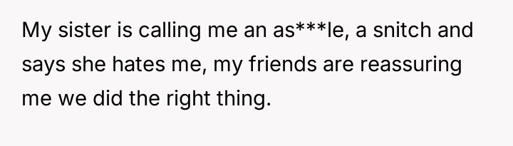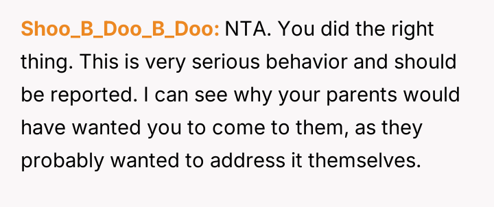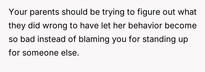 While the OP and his friends feel validated in protecting a victim, his parents view this action as a betrayal of their sibling bond.