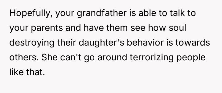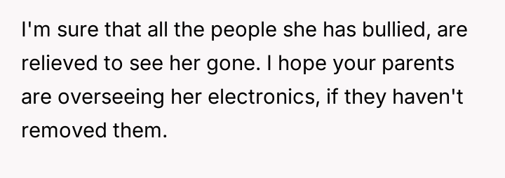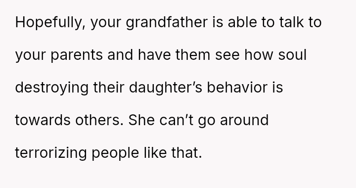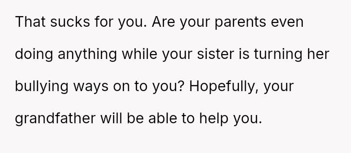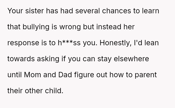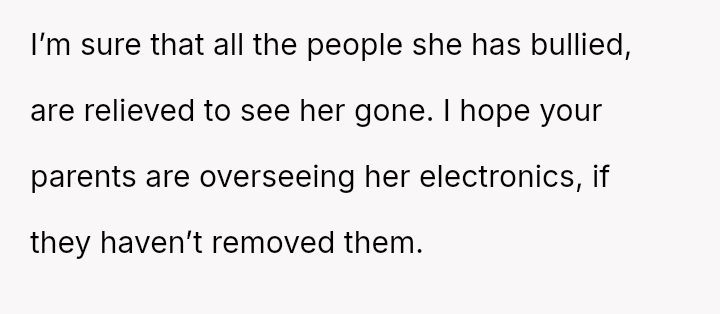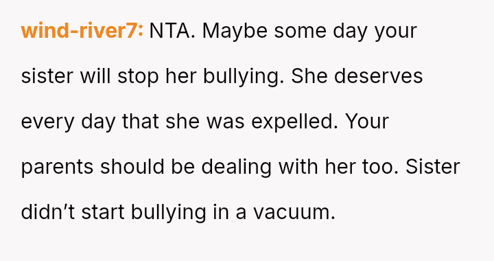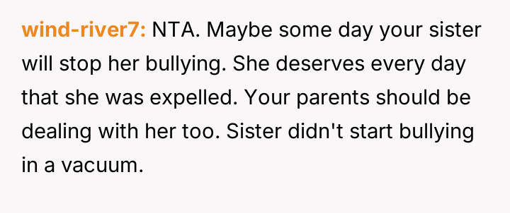 Given the severity of the bullying, was the OP justified in reporting his sister to the administration for expulsion, or should he have adhered to his parents' wishes to handle the matter privately within the family?
