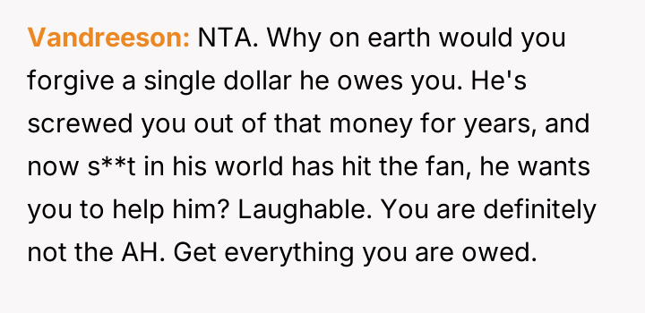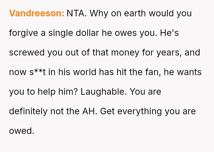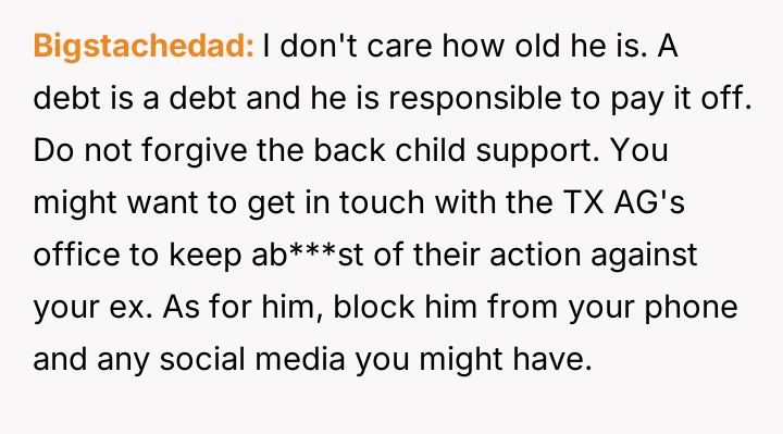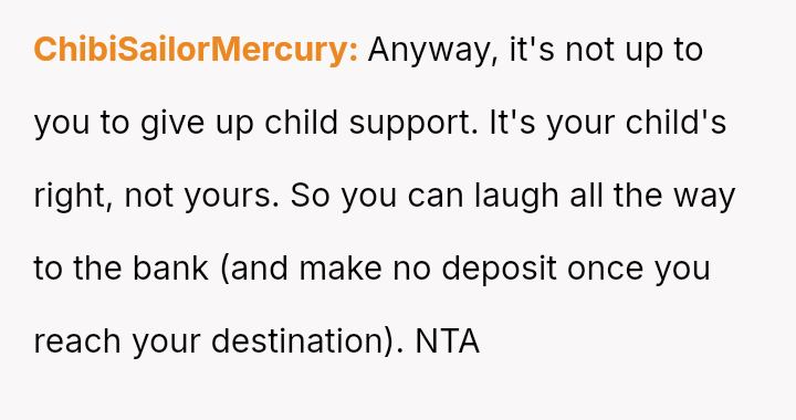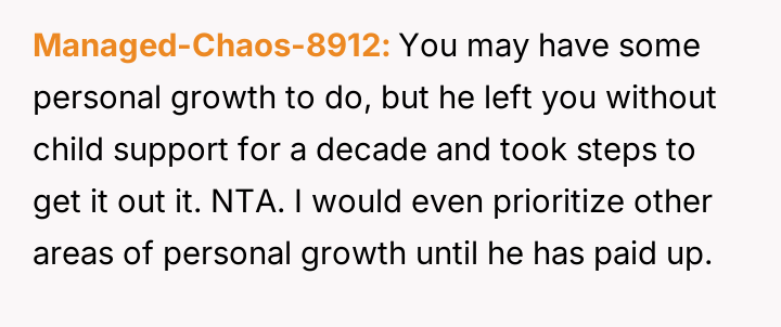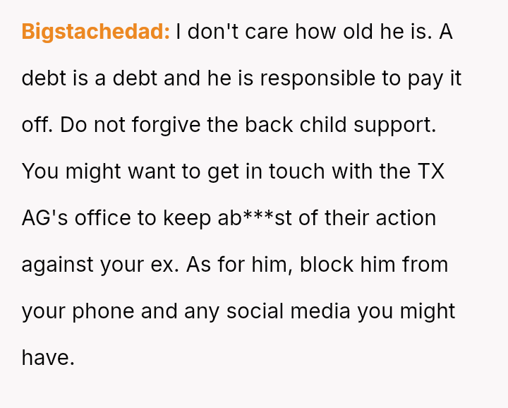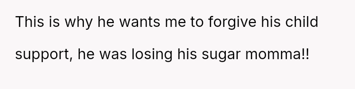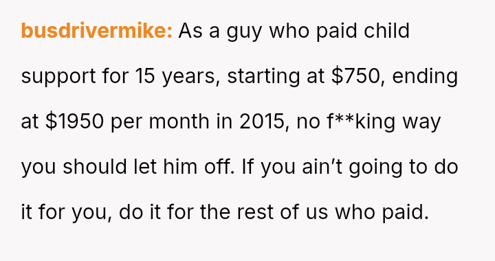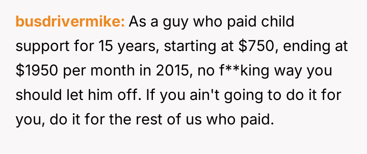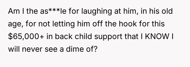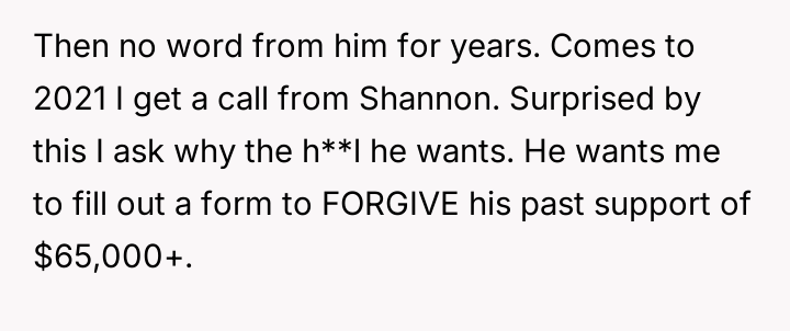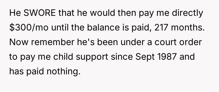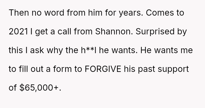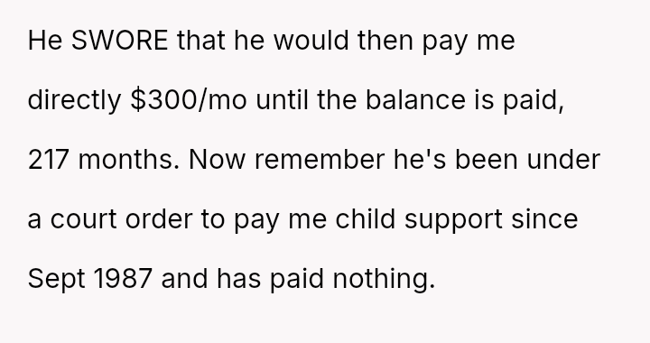 Decades later, in 2021, he contacted the poster asking her to forgive over $65,000 in accumulated back support, promising to pay $300 monthly directly if she did so, leading the poster to question her reaction to this request.