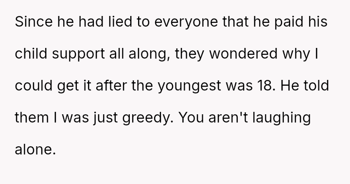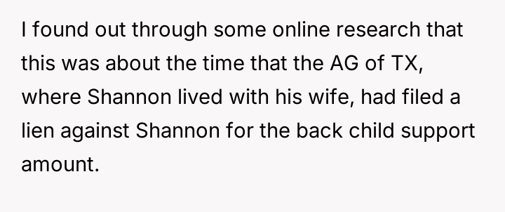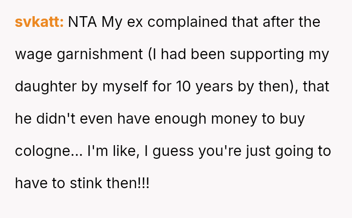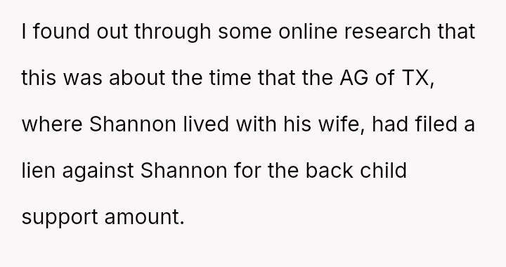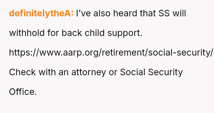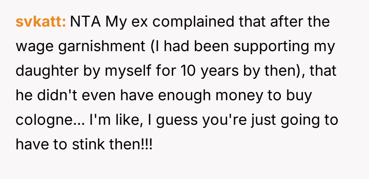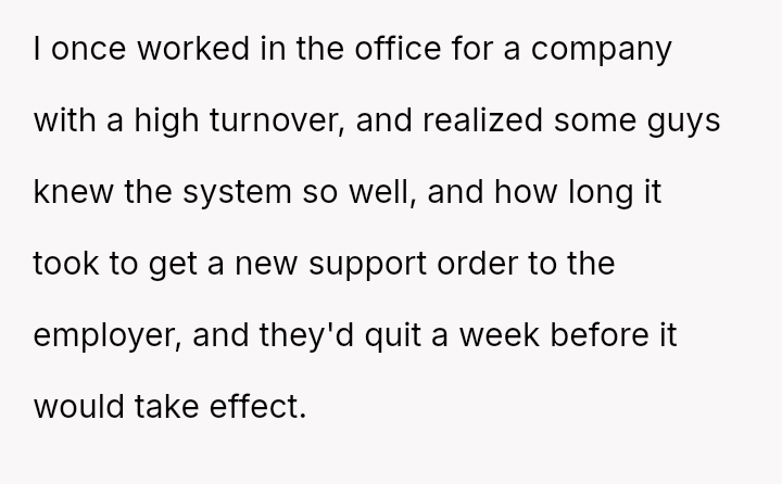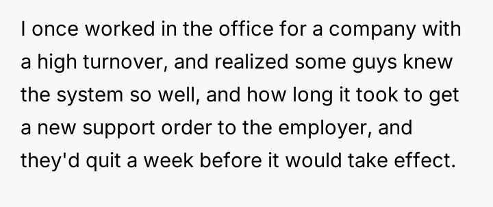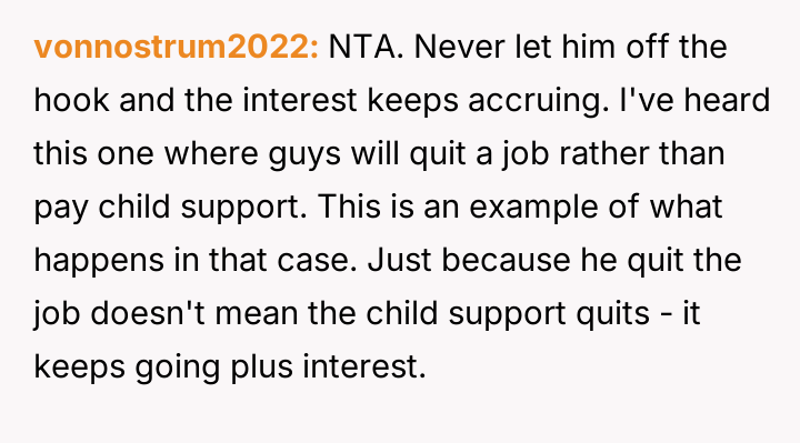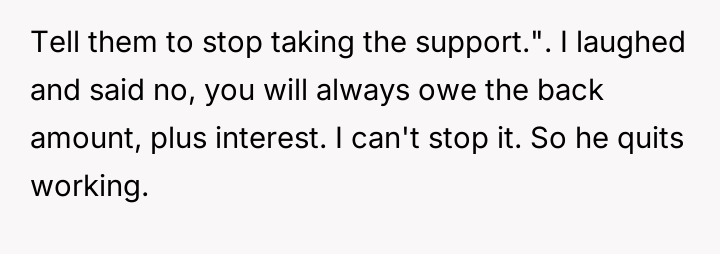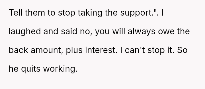 When the ex-husband called to stop the payments, the poster informed him he was still responsible for the accumulated back support and interest. He responded by quitting his job to avoid the garnishment.