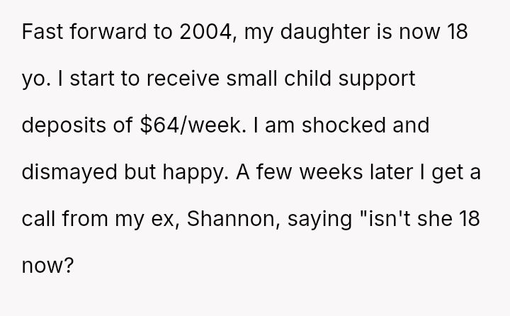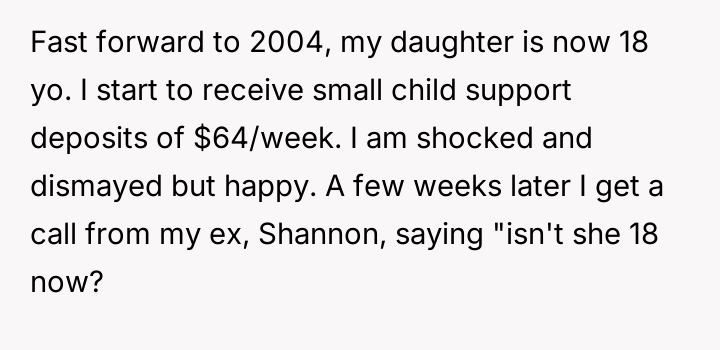 Years later, in 2004 when the daughter turned 18, support payments of $64 per week suddenly began being deposited.
