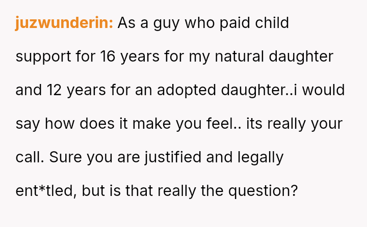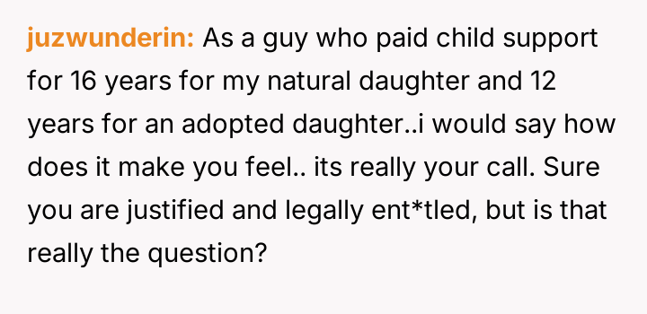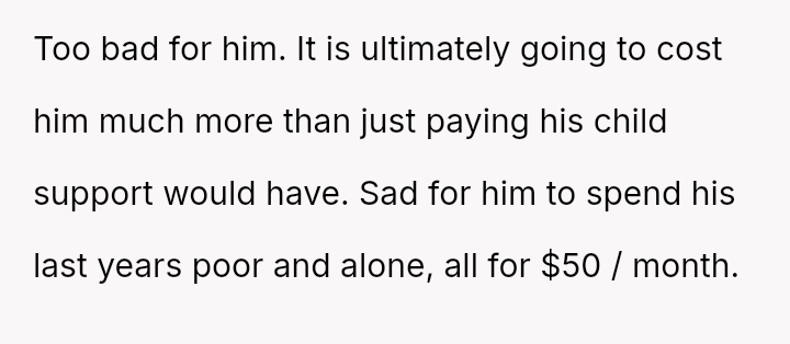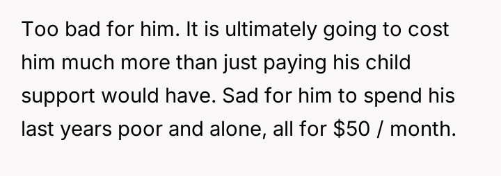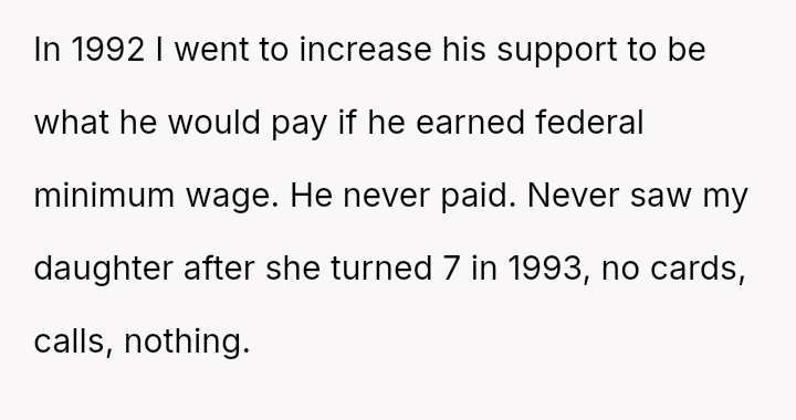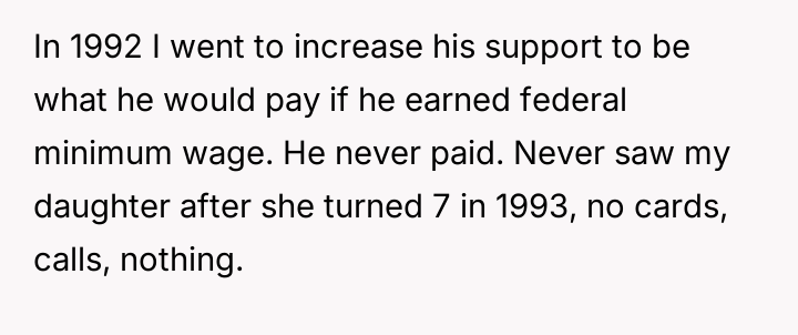 The poster later sought to increase the support amount based on federal minimum wage, but the ex-husband continued to pay nothing and stopped having contact with their daughter after she turned seven in 1993.