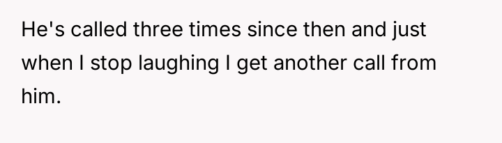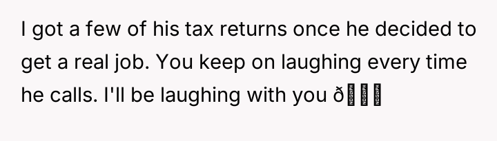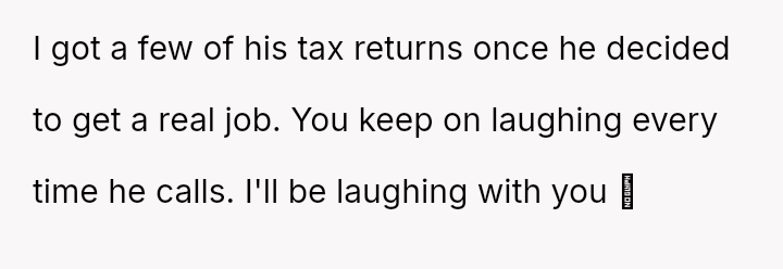 The poster feels justified in laughing at his predicament, given his long history of parental abandonment and financial evasion.