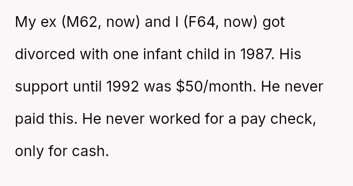 The poster, now 64, divorced her husband (now 62) in 1987 when they had an infant child. From 1987 until 1992, the ex-husband provided no child support, despite the court order.