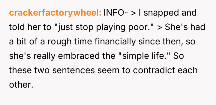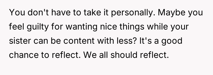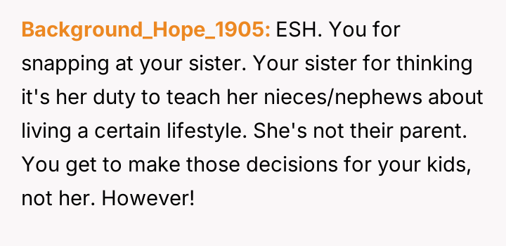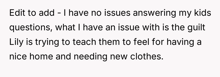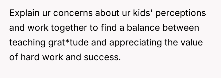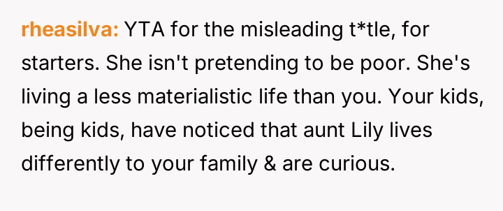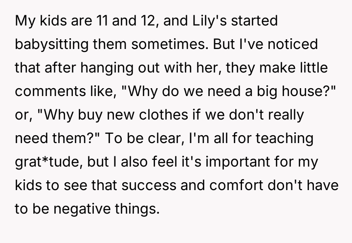 The OP feels the need to defend their hard-earned success and prevent feelings of guilt in their children, leading to an argument where the OP told the sister-in-law to stop 'playing poor.' Is the OP justified in setting boundaries to protect their children's perception of their own life, or is the sister-in-law correct that she is simply sharing valid, contrasting life values, making the OP overly sensitive to differing viewpoints? Where is the appropriate line drawn between teaching grat*tude and instilling guilt?