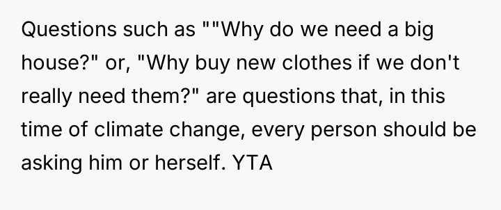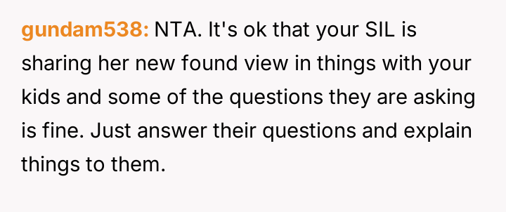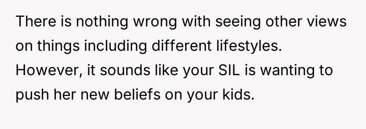 The original poster (OP) is struggling with a conflict where their sister-in-law's strong anti-materialistic stance is influencing the OP's children to question their family's comfortable lifestyle.