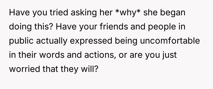 His actions stem from a desire to manage social perception and avoid alienating friends, which directly conflicts with his girlfriend's apparent desire to express herself through this specific mannerism.