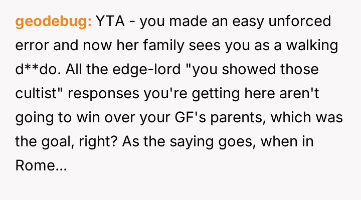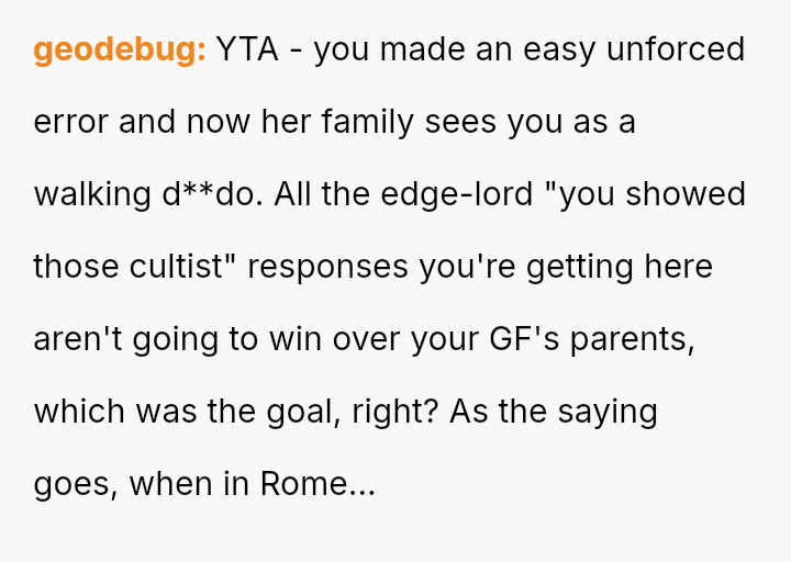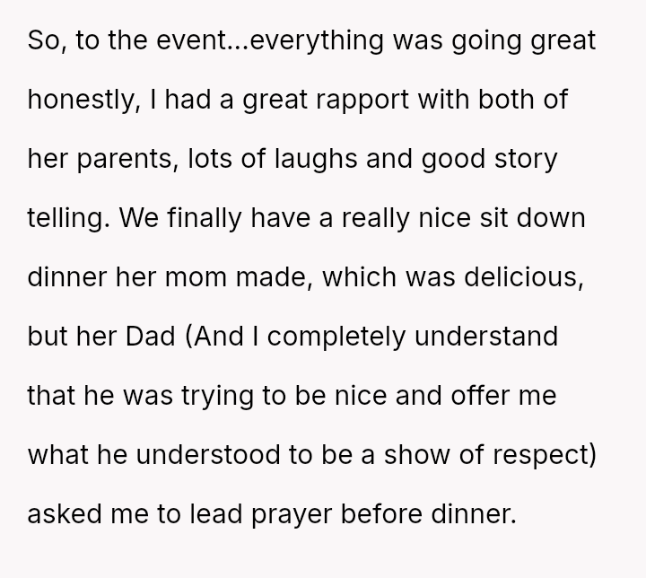 Was the poster's decision to prioritize authentic belief over social harmony the correct choice in a first meeting with in-laws, or would a brief, symbolic participation have better served the long-term goal of building a positive relationship, even if it required temporary compromise on personal conviction?