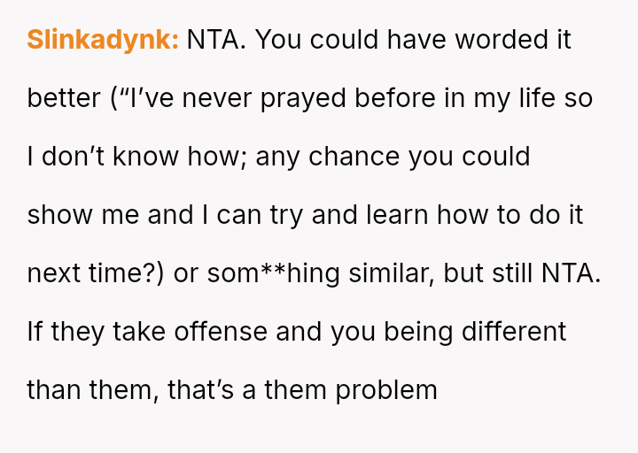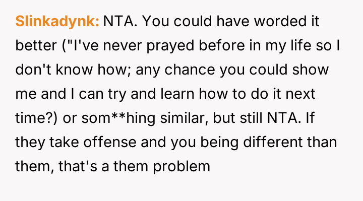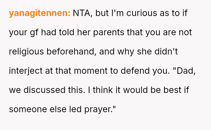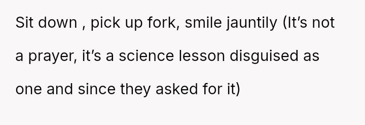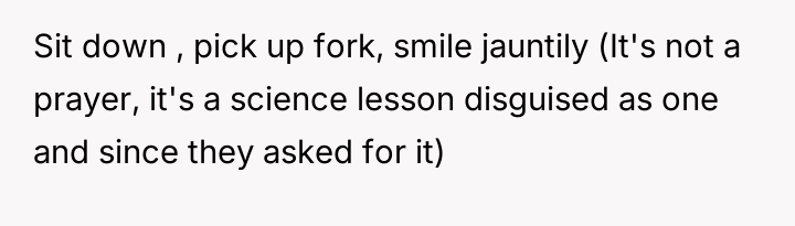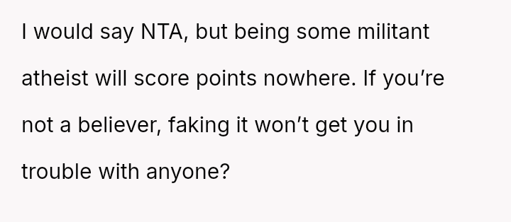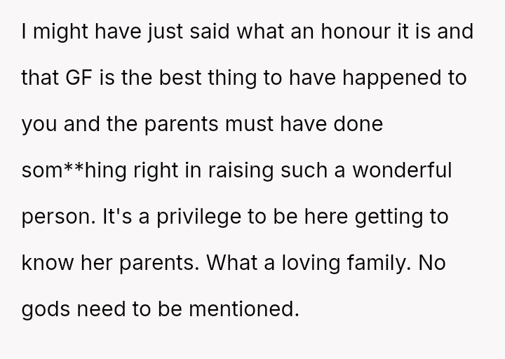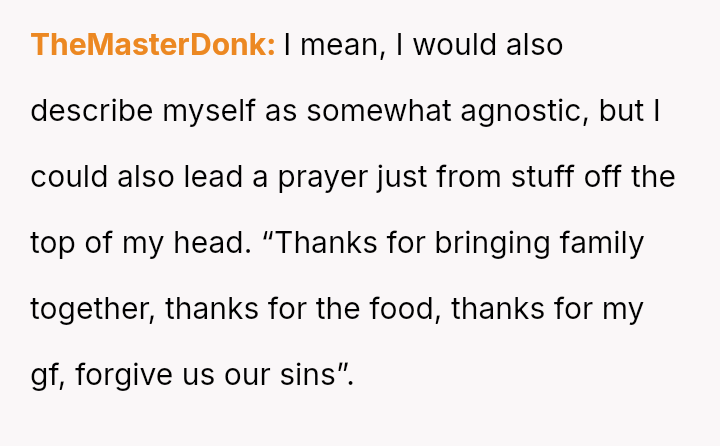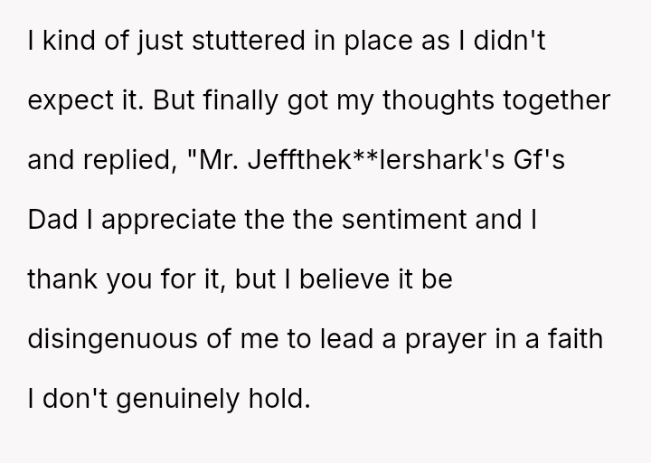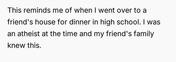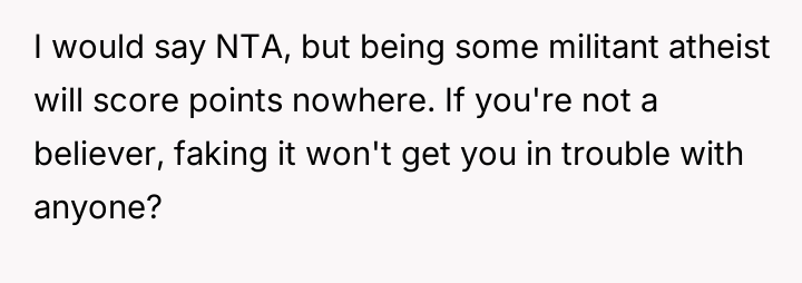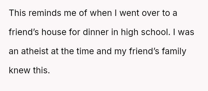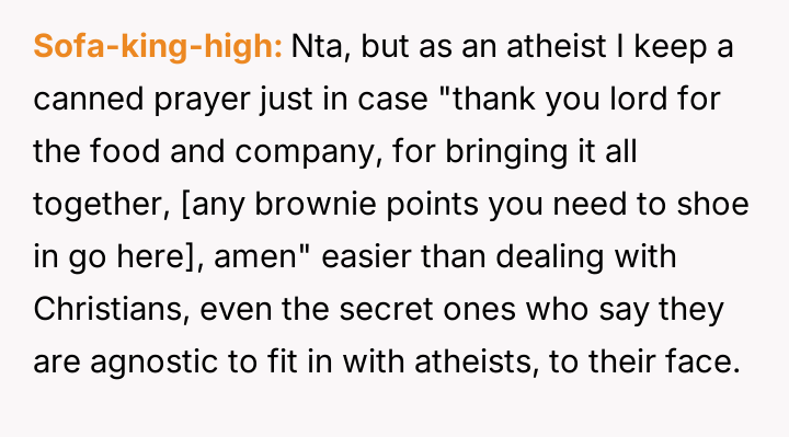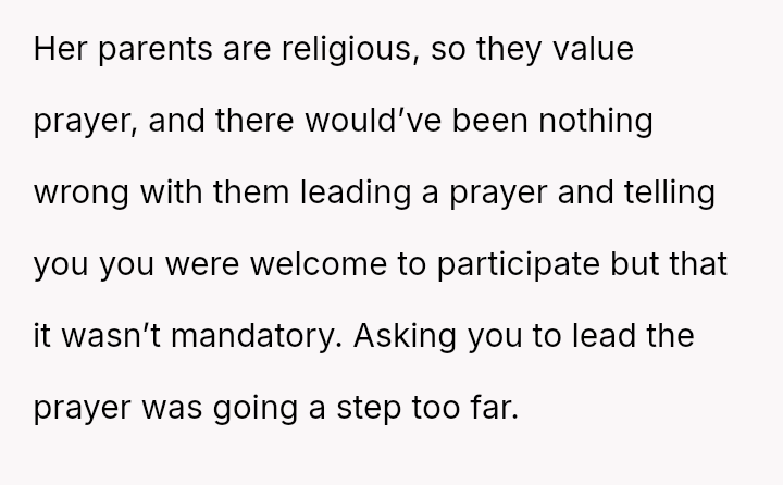 The original poster faced a difficult situation where his commitment to honesty regarding his non-religious beliefs clashed directly with his in-laws' expectation of a traditional, faith-based gesture of respect during a family meal.