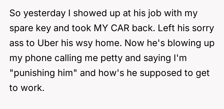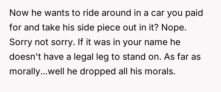 Given that the car remains legally the OP's property, the core question is whether reclaiming the asset const*tutes a justified consequence for in***elity or if it crosses the line into petty retribution that exceeds appropriate boundaries for dealing with the breakup?
