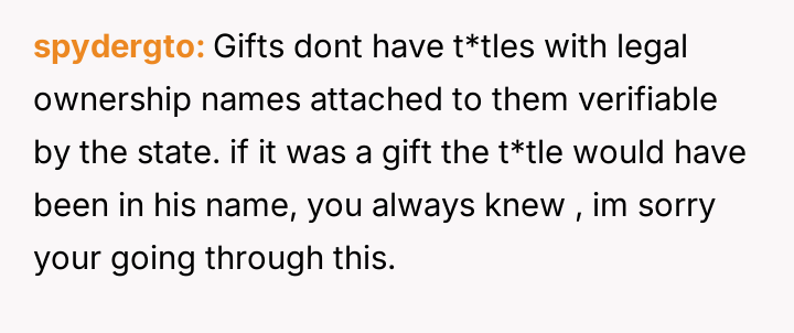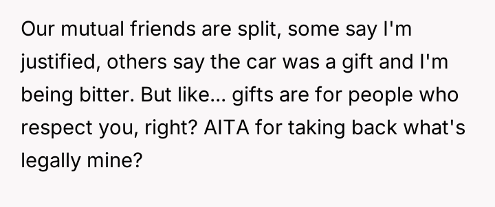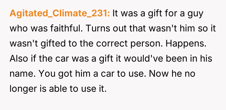 The original poster (OP) experienced a significant breach of trust due to her boyfriend's in***elity, leading her to take back a major gift—a car—that she fully owned.
