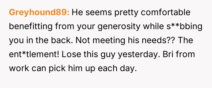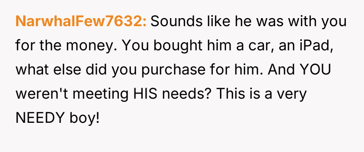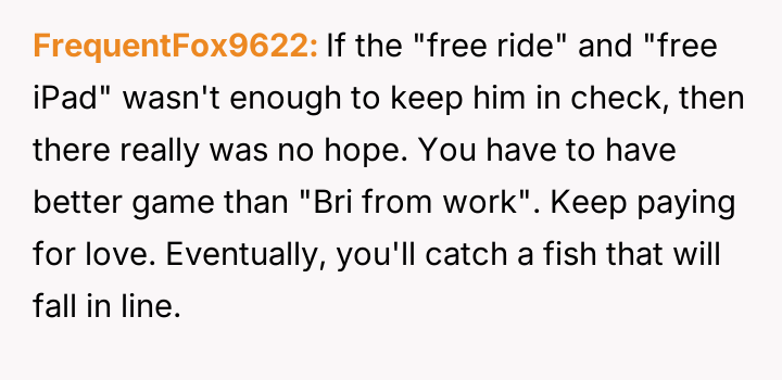 She gave him a chance, investing not just money but trust into their relationship by buying him a car to ease his struggles.