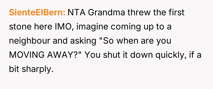 In response to sustained criticism, the OP delivered a harsh, immediate retort about the neighbor's mortality, feeling momentarily justified but later regretting the extreme nature of their words.