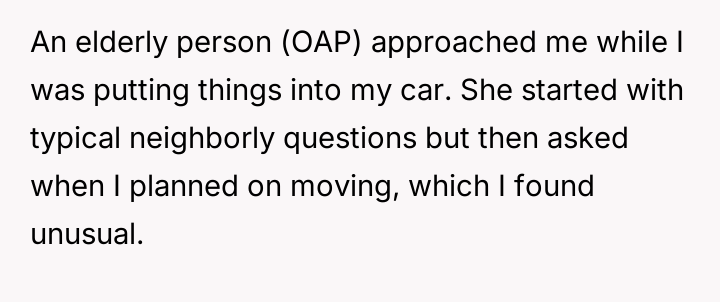 The original poster (OP) felt trapped by an aggressive and unwelcome conversation initiated by an elderly neighbor who expressed clear disapproval of younger families moving into the street.