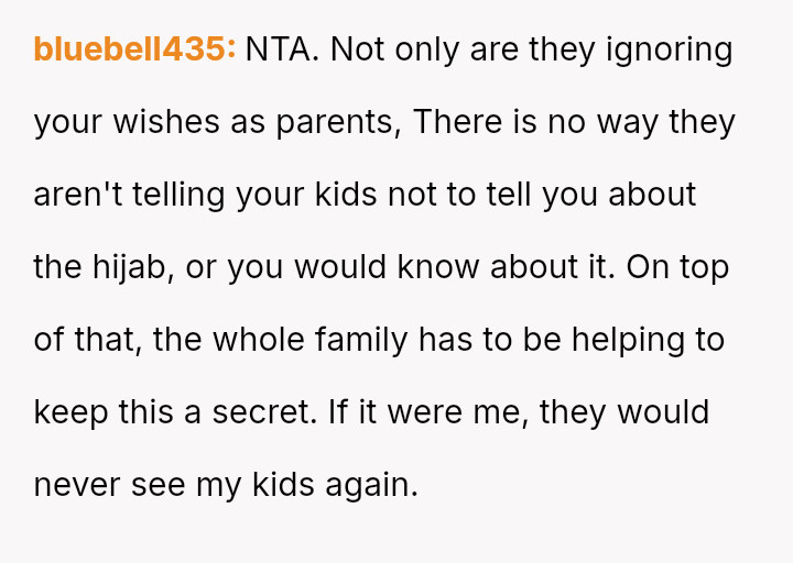 The original poster (OP) is standing firm in their decision to ban their children from visiting their in-laws after discovering the in-laws actively undermined the parents' explicit request regarding religious wear.