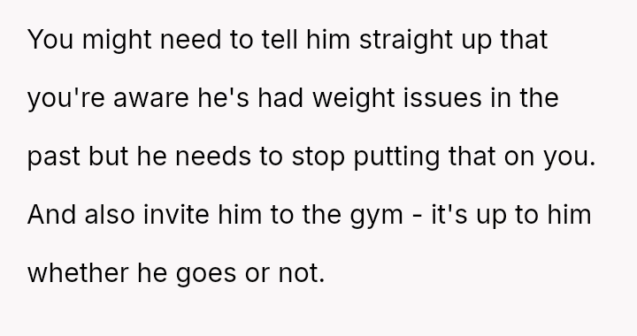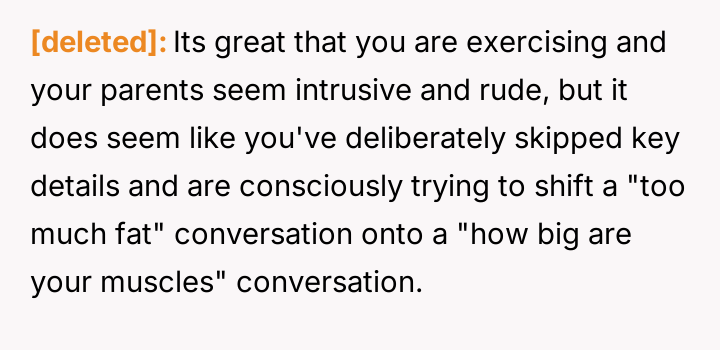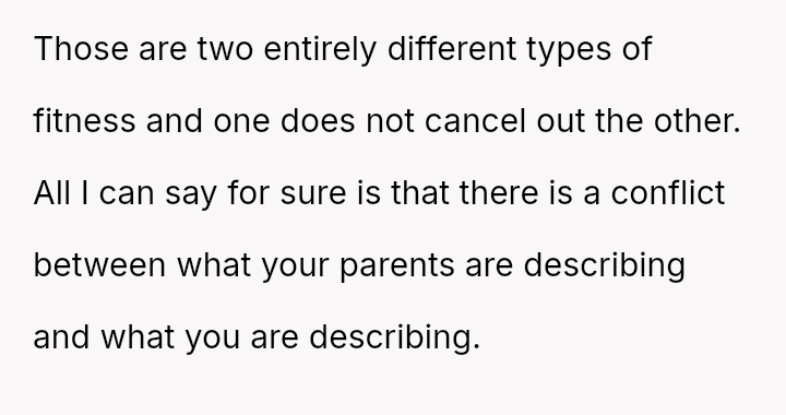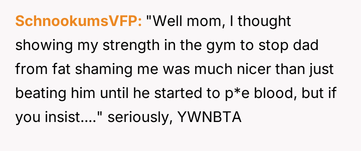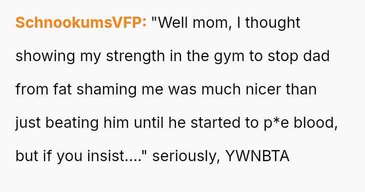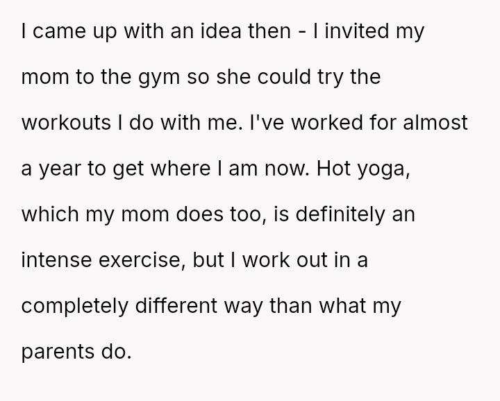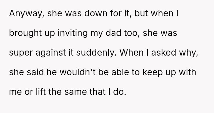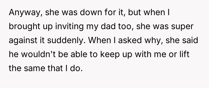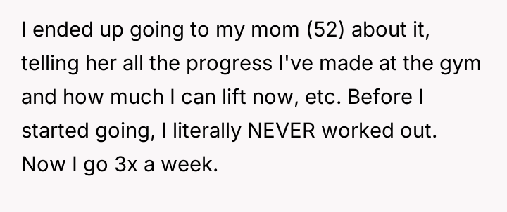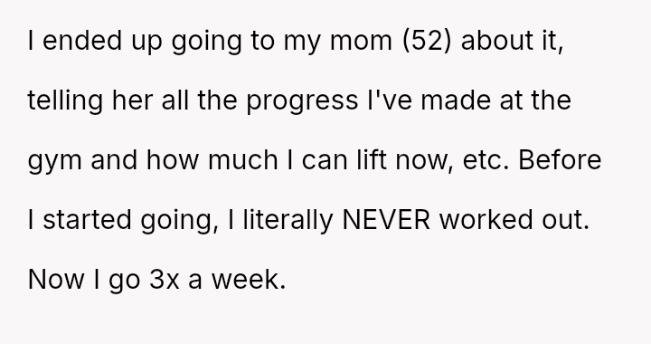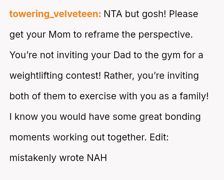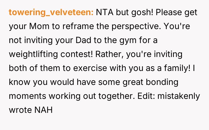 OP's attempt to es**blish boundaries by inviting her parents to the gym—a place where she has made verifiable personal progress—was redirected by her mother, who feared the father's ego would be damaged by realizing his daughter's physical superiority.