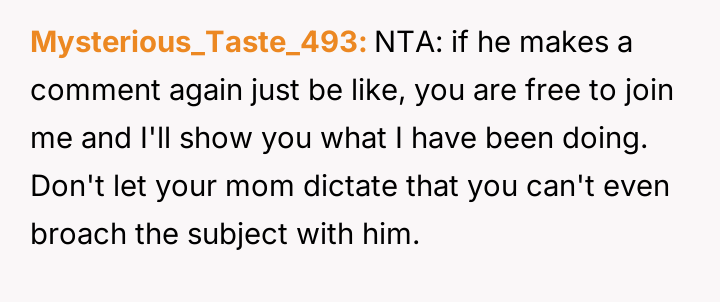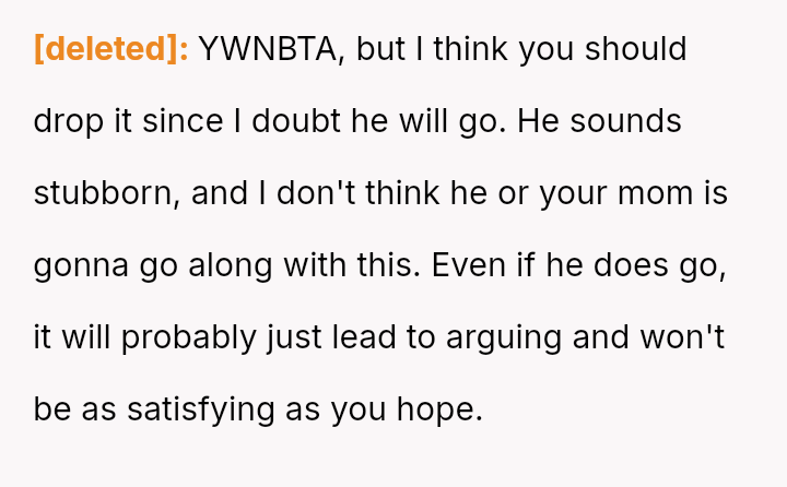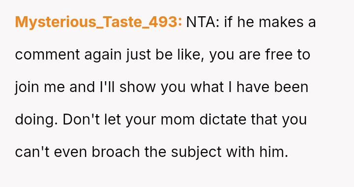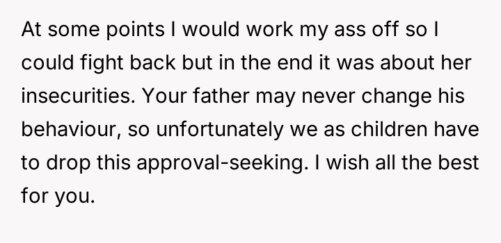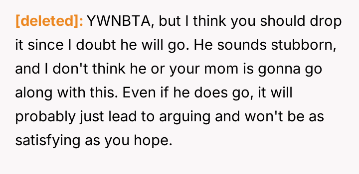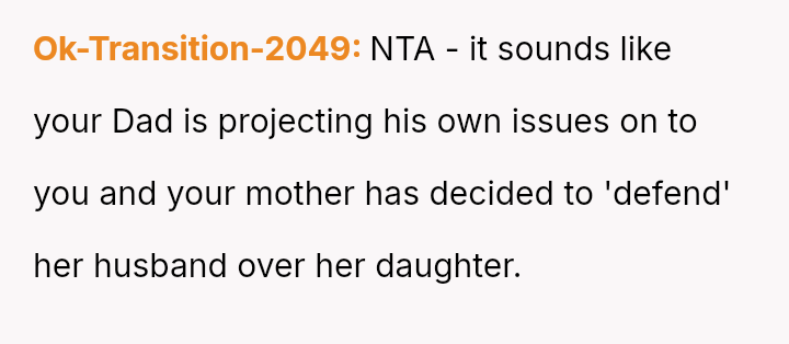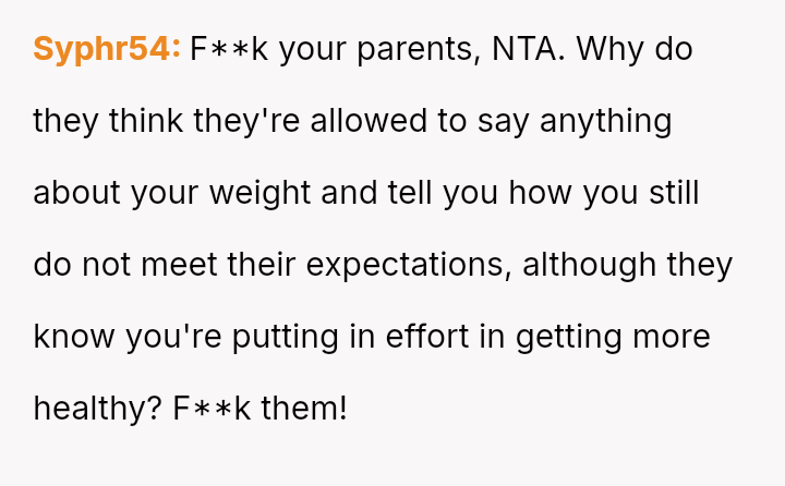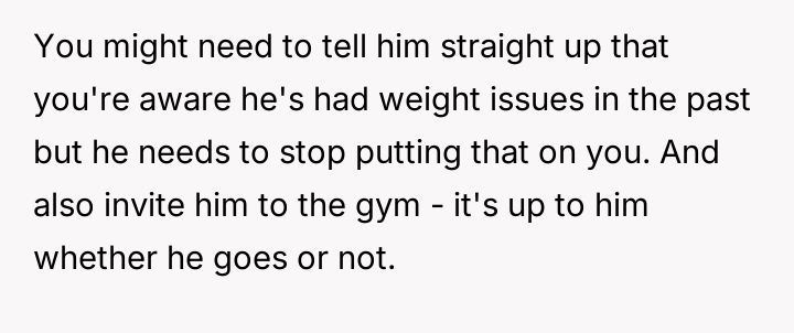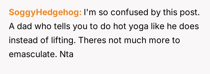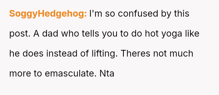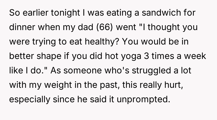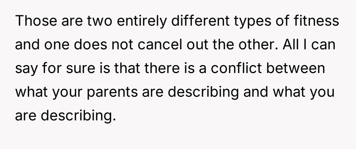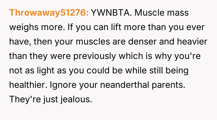 OP's attempt to es**blish boundaries by inviting her parents to the gym—a place where she has made verifiable personal progress—was redirected by her mother, who feared the father's ego would be damaged by realizing his daughter's physical superiority.